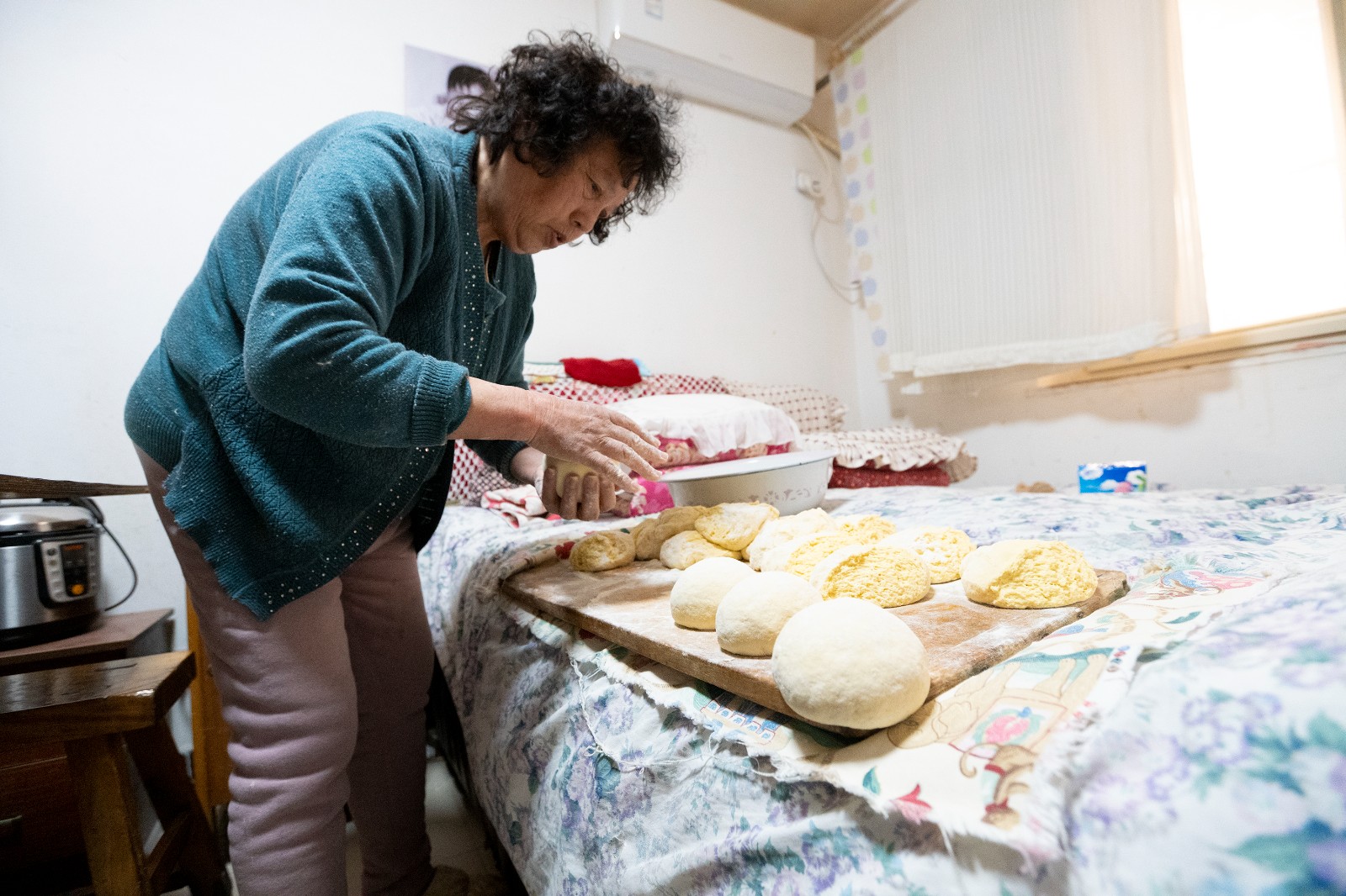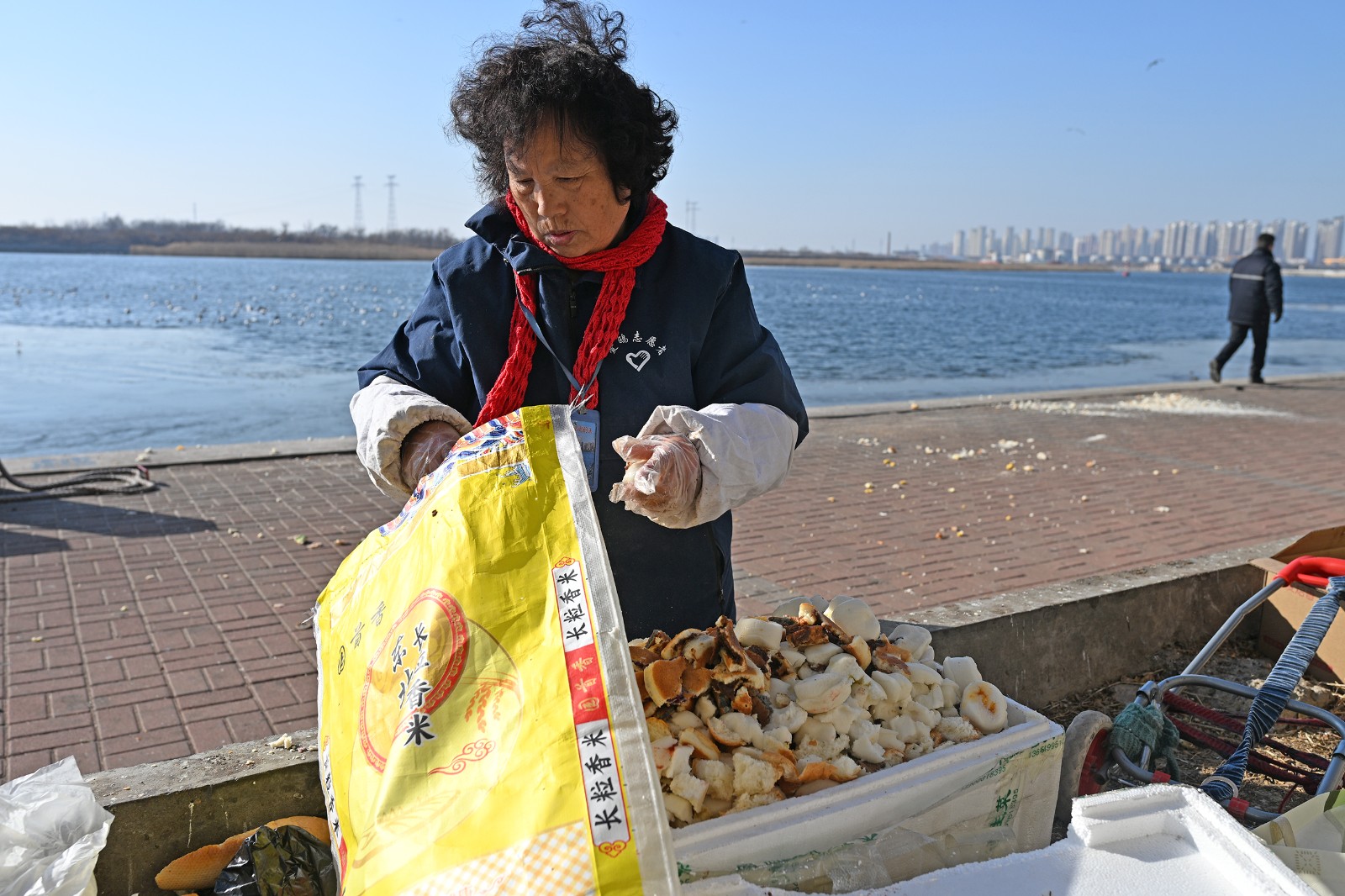 种子逐渐生长。2014年,路过的王和平被老码头船锚与海鸥的景象吸引,自此加入。“一开始我是投喂者,但没有食物给它们,我就想,自己蒸馒头吧,没防腐剂、添加剂。”她自己也没想到,这一蒸,就是11年。如今72岁的王和平,每日雷打不动蒸制2-4锅馒头,一买面粉就是4袋(约20天用量)。“它们不远万里来,就为吃口饭。不来,它们会饿死、冻死。”她语气平静,却字字千钧。她与后来加入的屠文彪等人一起,将早年泳友们“零散撇一把”的投喂,逐步变成了规范流程:先捡拾垃圾、分拣食物,每日下午一点半准时投喂。