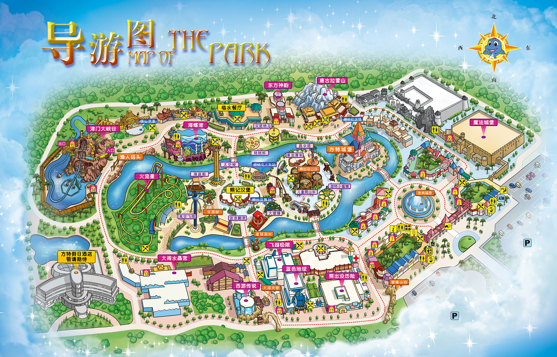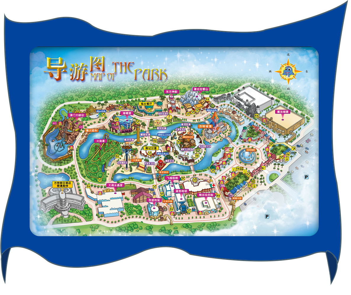 魔法城堡→唐古拉雪山→东方神韵→双层转马→转转杯→海螺湾→海盗船→高空飞翔→跳伞塔→飞越极限→蓝色地球→熊出没历险记→方特城堡