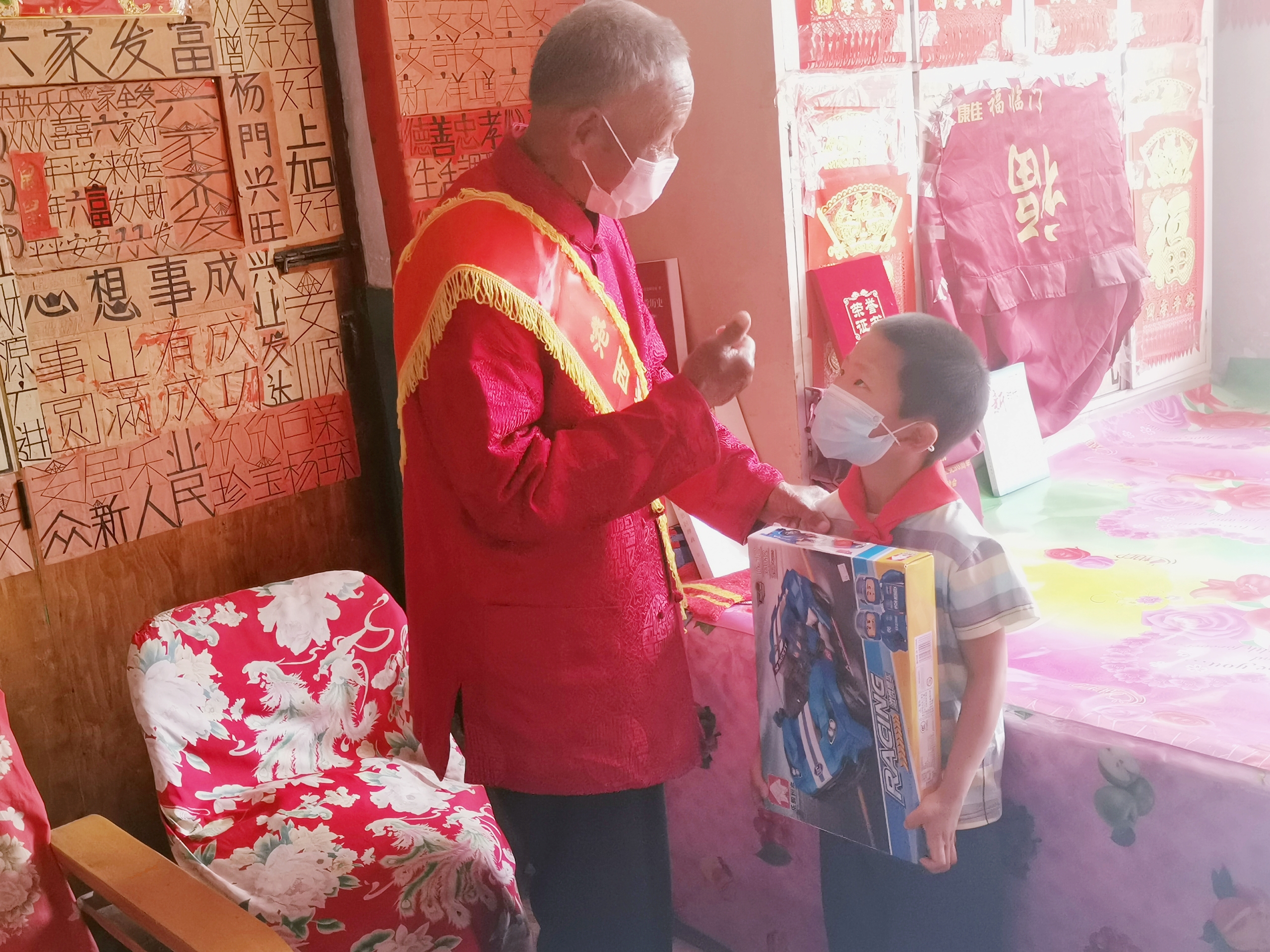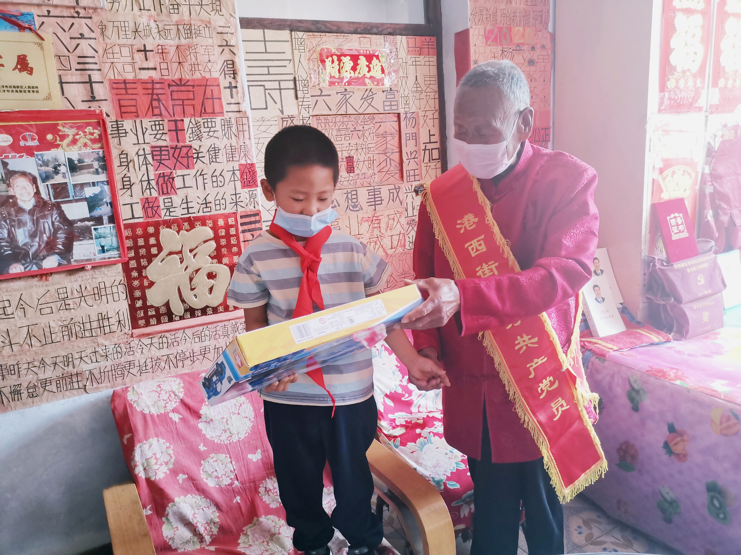十几天前,海滨街花园南里社区带同天过生日的“小寿星”高天翼为结对共建单位远景三村90岁高龄的老党员杨安森过了一个难忘的生日,杨老对这个6岁的小男孩儿一直记挂在心,并委托村委会为男孩儿准备了一份儿童节礼物。随后,远景三村依托组织在线平台发布“红色基因,薪火相传”任务单,寻找志愿者帮杨老为男孩过一个特别的“六一”节。