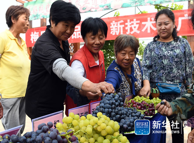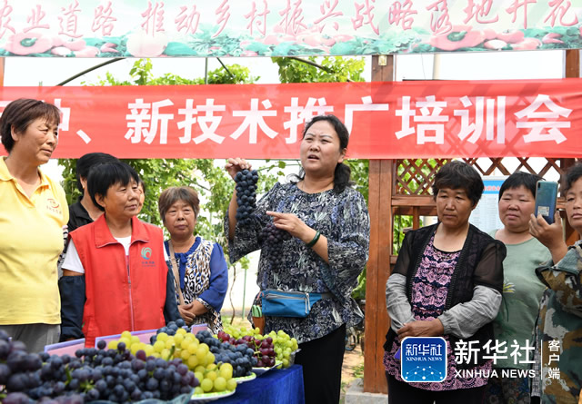 ↑6月11日,在天津市武清区梅厂镇“金锅生态园”,天津农学院教授田淑芬(前右一)向果农介绍葡萄栽培新技术。新华社记者 马平 摄