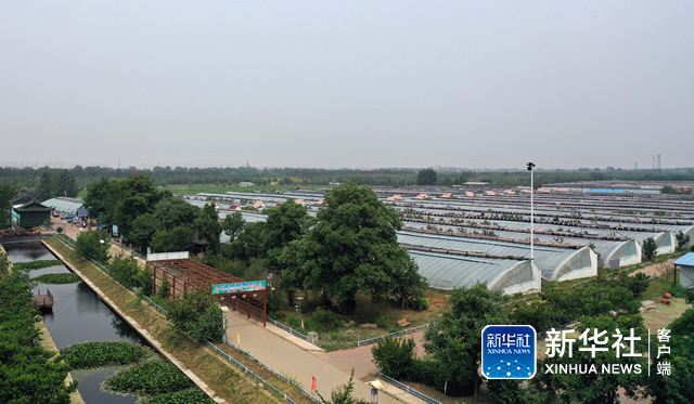 ↑这是6月11日在天津市武清区梅厂镇灰锅口村拍摄的“金锅生态园”葡萄大棚(无人机照片)。新华社记者 马平 摄