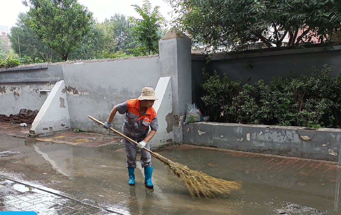 物业工作人员在清扫积水