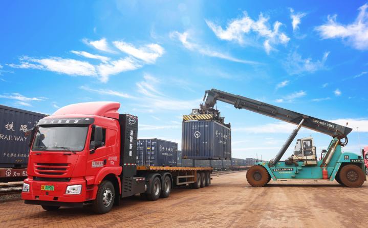 荣程集团购置的氢能重卡正在装载集装箱。(受访者供图)