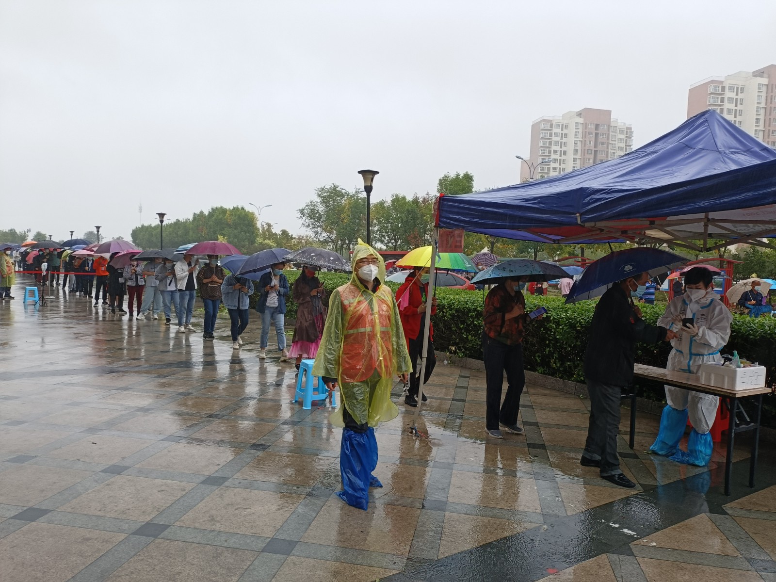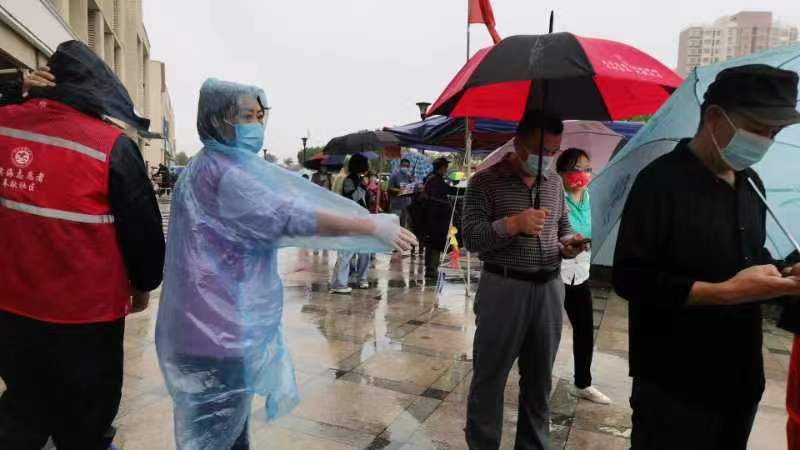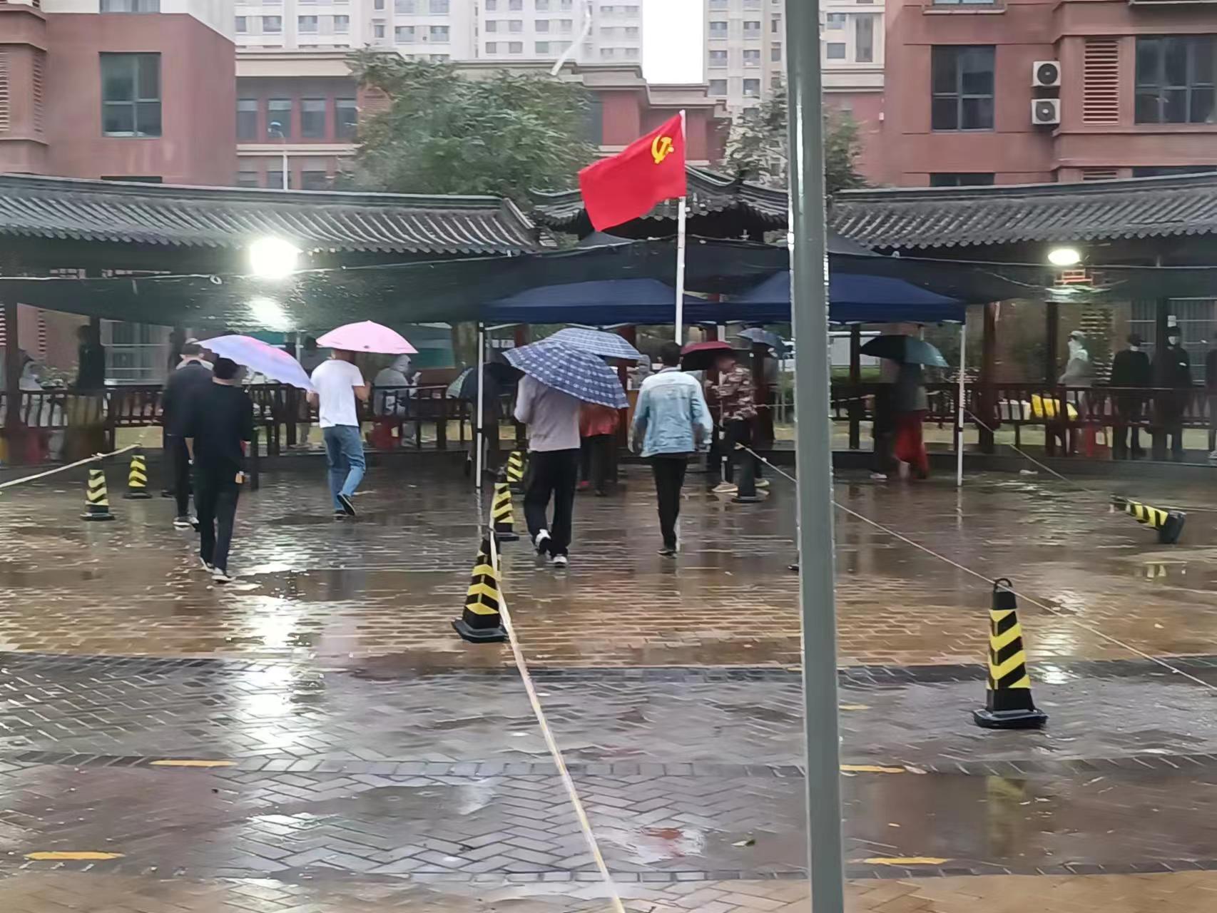 津滨网讯 10月3日,虽然天空下着雨,给抗疫工作带来诸多不便,但面对新的挑战,滨城社区工作人员、下沉党员干部、医务人员、志愿者,用责任和爱心,为居民撑起遮风挡雨的“疫情防护伞”,一起坚守在风雨一线,确保了核酸检测等抗疫工作始终高效有序进行。