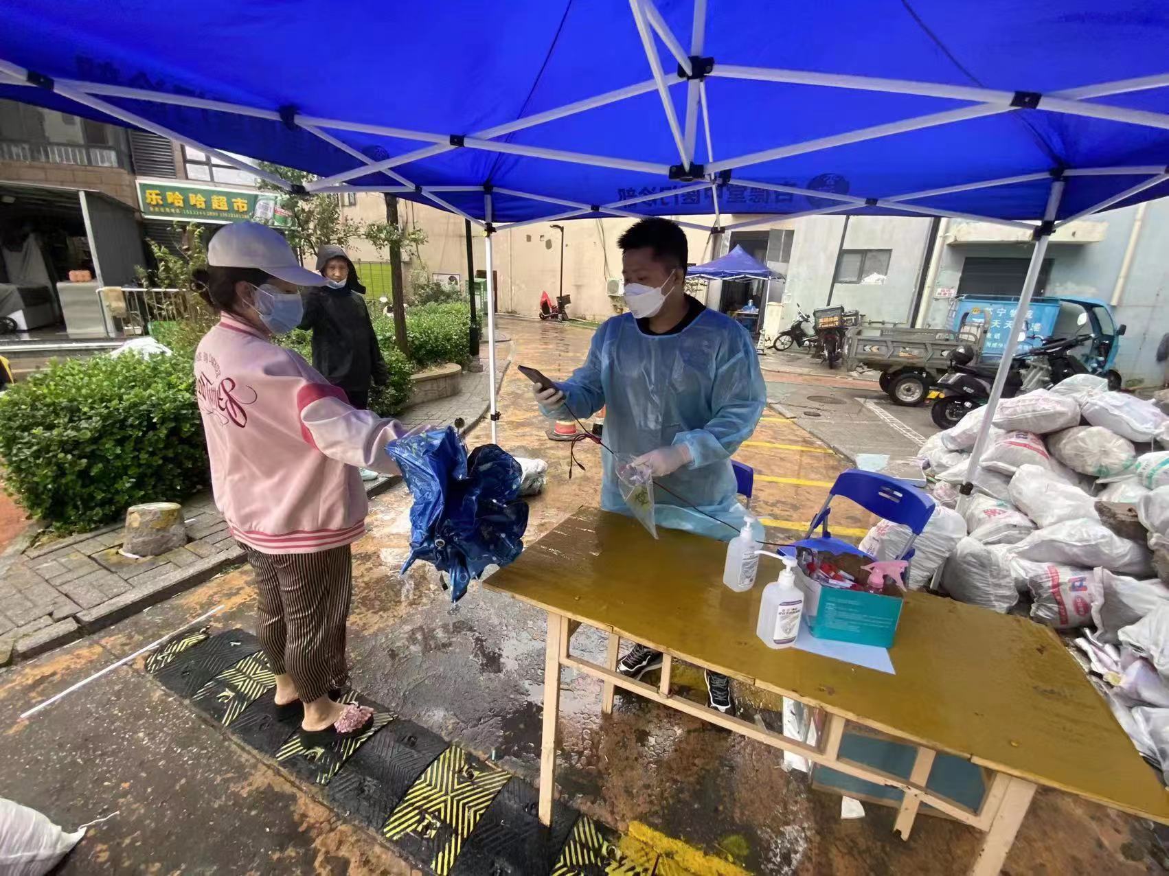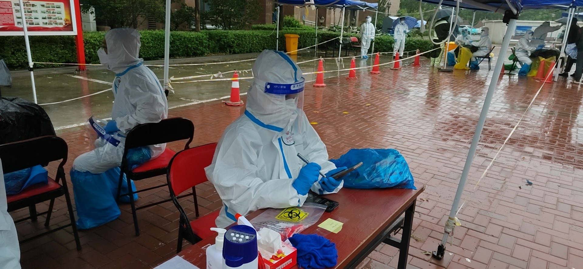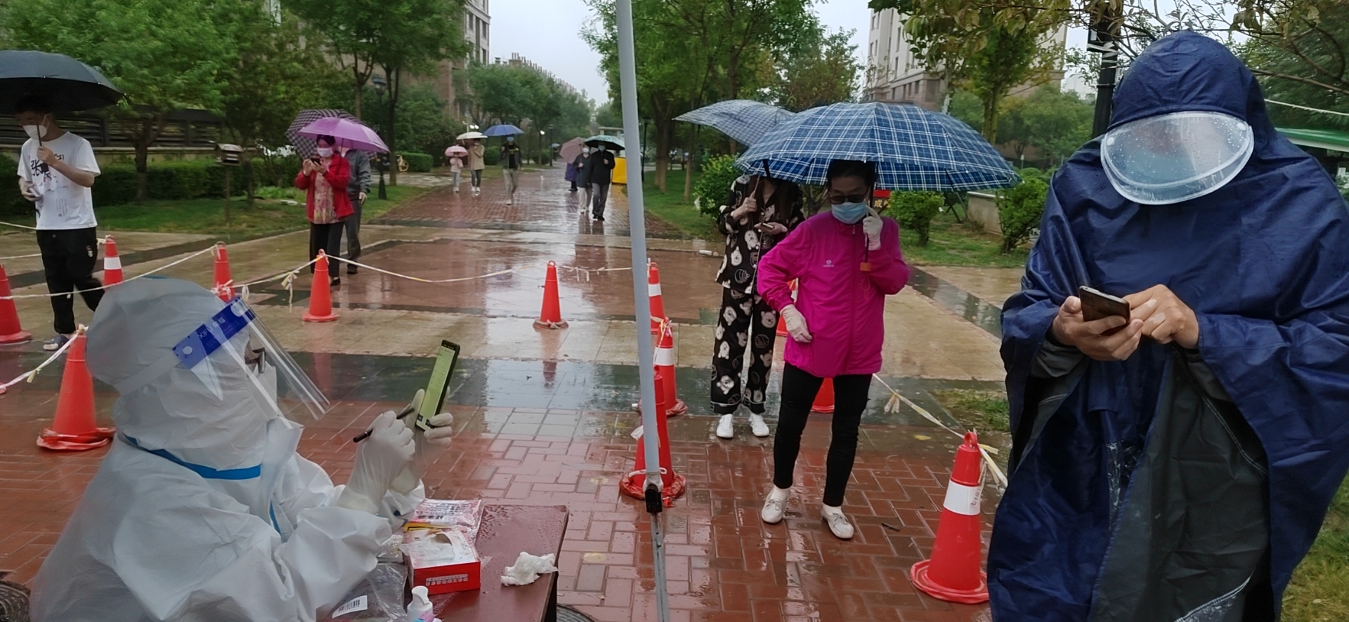 10月3日凌晨四点,北塘街道宁车沽西村的工作人员已经开始准备核酸筛查需要的物资。除此之外,为应对雨天,他们还准备了一些雨具等防水用品。在核酸筛查检测点,村委会工作人员在防护服外套上了雨衣,引导市民亮“码”、有序排队。另一方面,村里的志愿者引导着村民们错峰排队,也大大提高了核酸检测的效率。