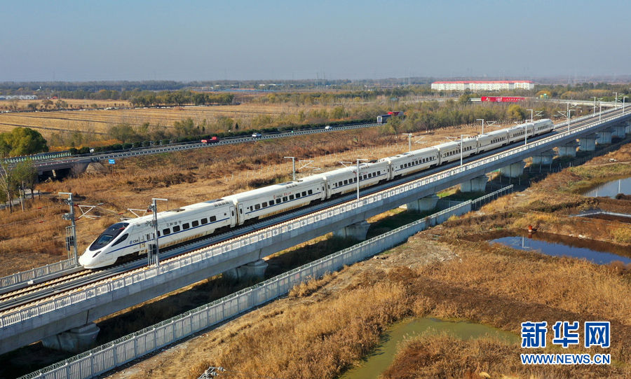 11月14日,一列动车组试运行列车行驶在京滨城际铁路宝坁段线路上(无人机照片)。新华网发(杨宝森 摄)