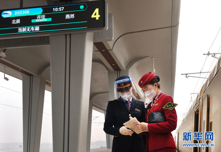 京滨城际铁路北辰站站台上,列车长与服务人员进行交接作业(11月9日摄)。新华网发(杨宝森 摄)