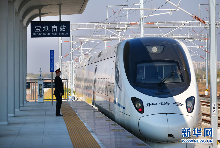 11月14日,一列动车组试运行列车驶出京滨城际铁路宝坁南站,服务人员标准立岗作业。新华网发(杨宝森 摄)