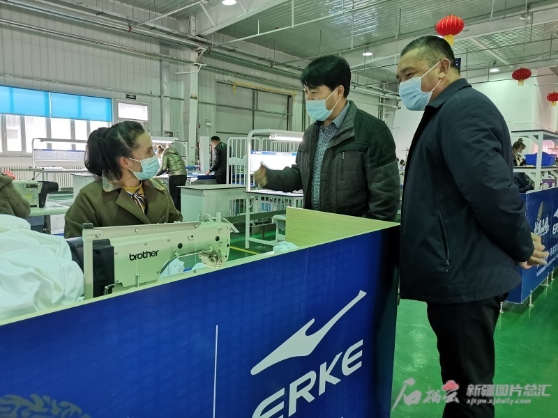 ▲薛军(中)在鸿星尔克(集团)新疆鸿荣轻工有限公司考察。天津援疆供图