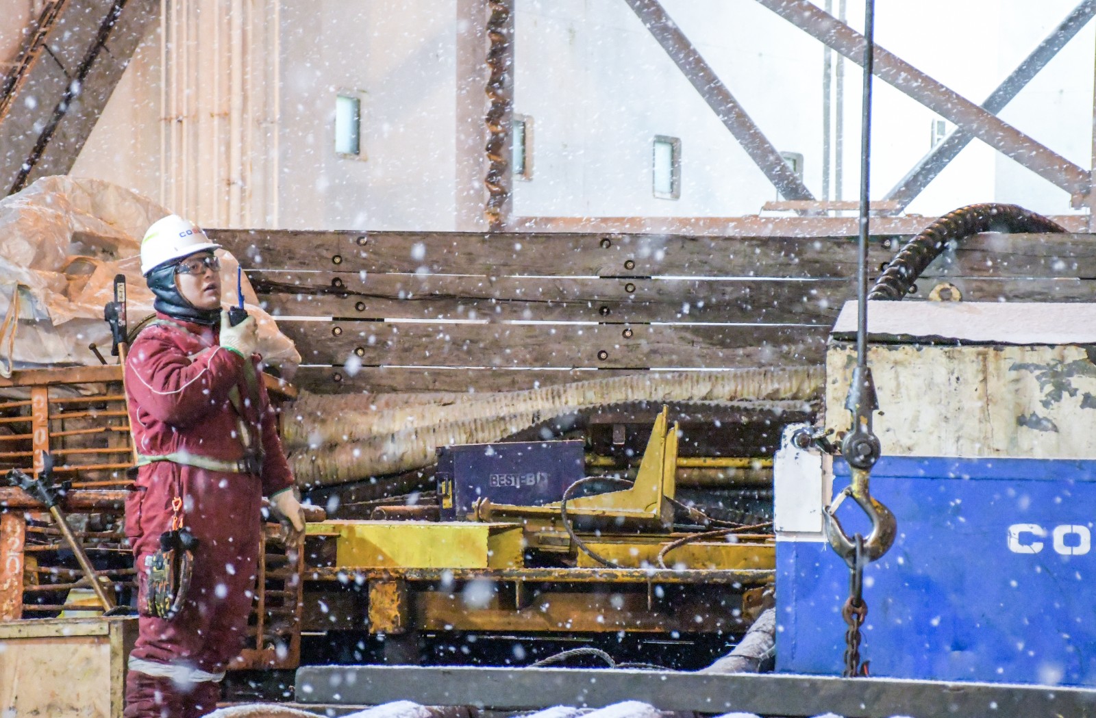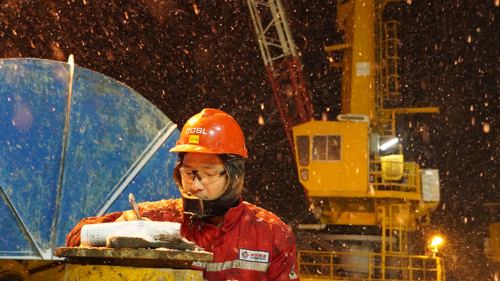 凌晨4时,钻台开始组合旅大5-2N的三开电测工具,一节又一节仪器有条不紊地往钻台吊运。忙了一晚上的甲板长王师傅拍了拍身上的碎雪,准备倒换着吃饭换人,走在半道上一股寒风突然扑来,打在了他的脸上,猛然一个哆嗦。