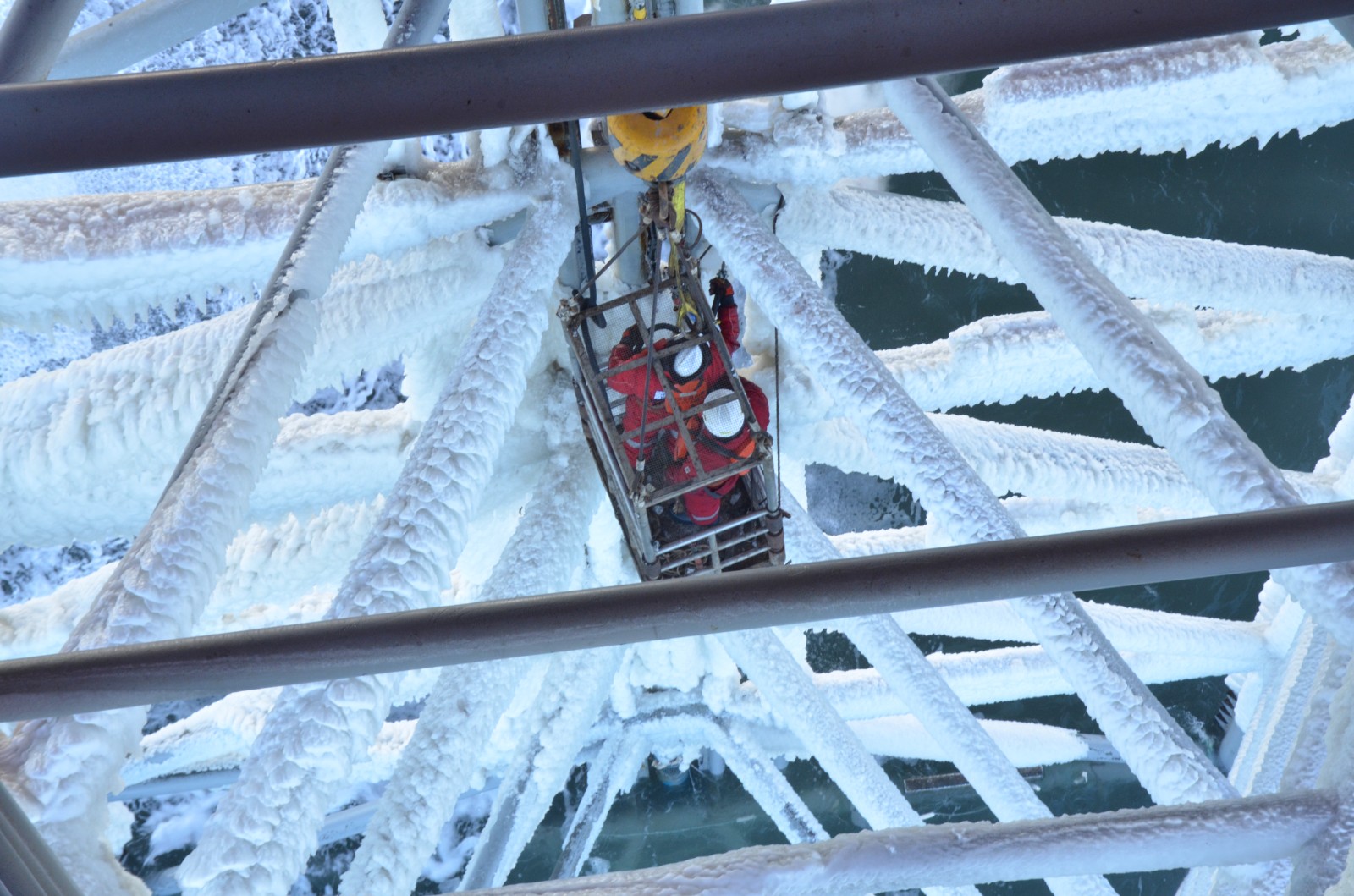 穿得厚重的两位甲班工在寒风中冻得根本站不稳,当他们试着摘掉挂在吊钩上的安全销时,才发现被他两拧成弯的安全销一眨眼功夫就被冰冻得紧紧地粘在了一起。戴着防夹手套的双手也好像被冻得在半空中迷失了方向,颤颤巍巍根本捏不住安全销的开口。
