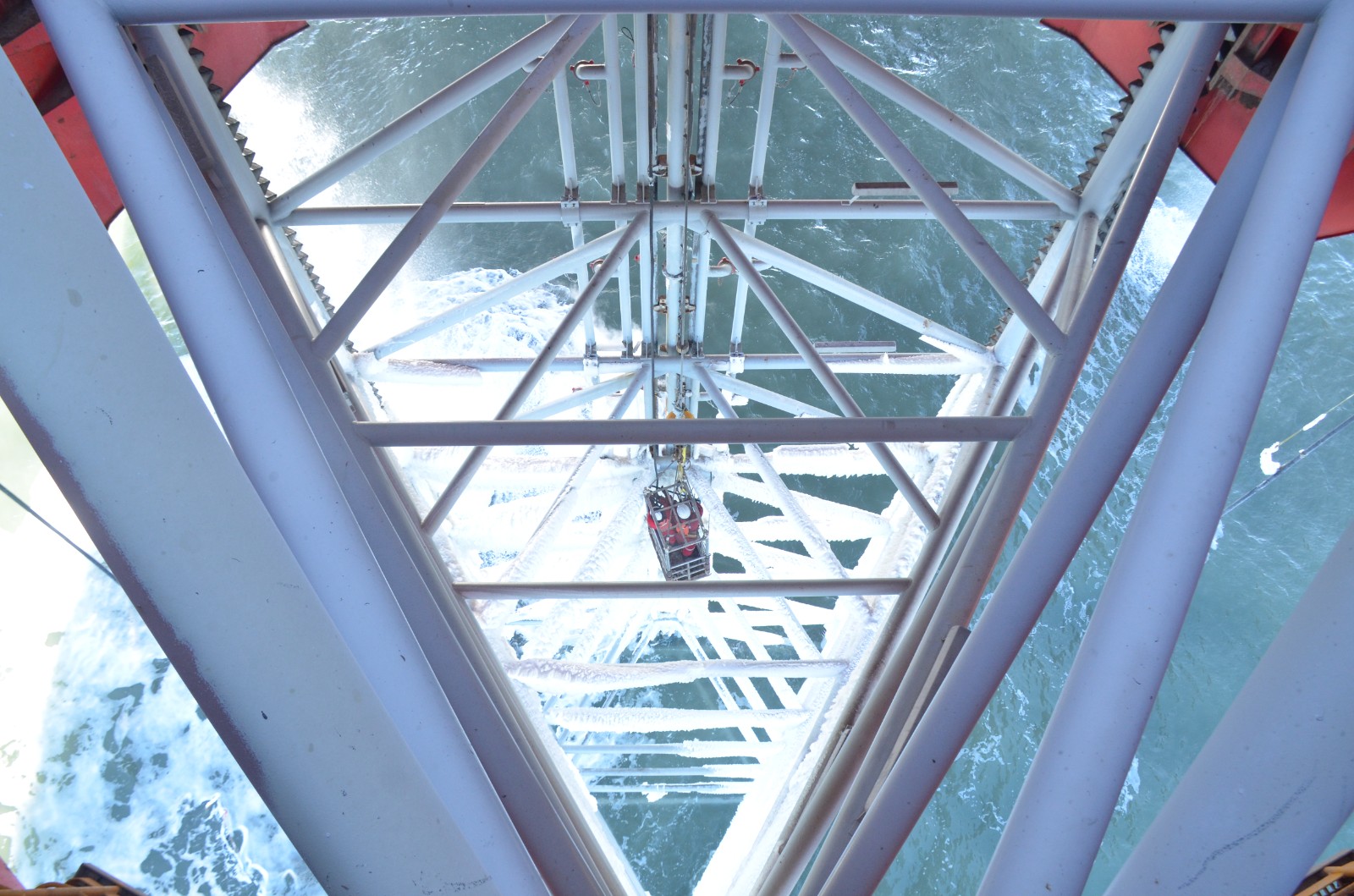 “起钩!”挂好钩,重新锁上安全销后,王师傅一声令下,换成折臂吊的仪器在吊车司机的操作下稳稳当当地落在了钻台风板里面。