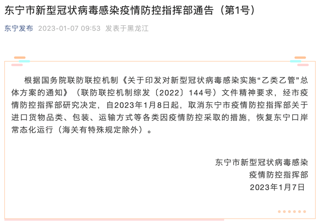 黑龙江省东宁市:1月8日起,取消东宁市疫情防控指挥部关于进口货物品类、包装、运输方式等各类因疫情防控采取的措施,恢复东宁口岸常态化运行(海关有特殊规定除外)。