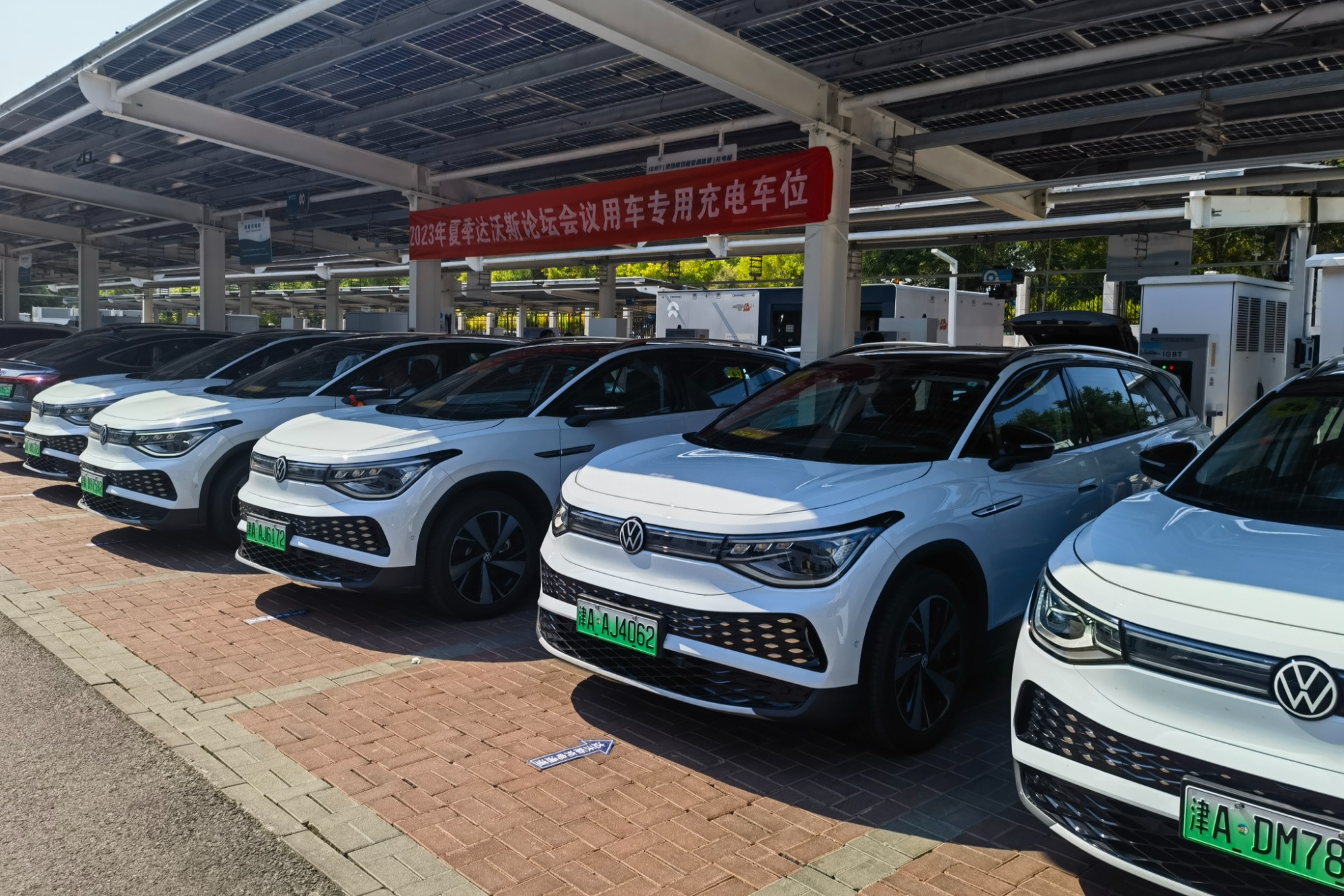 记者在现场看到,综合服务中心内专门划分出6个专用充电车位以便通勤保障车辆充电,据高帅介绍,6个充电桩均使用“绿电”进行交易,其中1个充电桩以光伏发电供能,其它则为“IGBT”(绝缘栅双极型晶体管)大功率充电桩,预计能充分缩短新能源车一半以上的充电时间,一般30分钟左右即可完成充电,使保障车辆中转效率大大提高。“会议期间,160辆通勤保障车辆预计充电量将超过3万度,可减少燃油排放12吨,减少二氧化碳排放38吨,充分展现了达沃斯论坛低碳环保、绿色出行的理念。”高帅说道。
