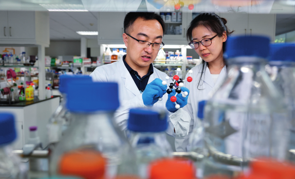 中国科学家实现从二氧化碳到糖的精准全合成。图为在中国科学院天津工业生物技术研究所实验室,杨建刚副研究员(左)和宋皖博士讨论工作进展(2023年 8 月 13 日摄) 金立旺摄 / 本刊