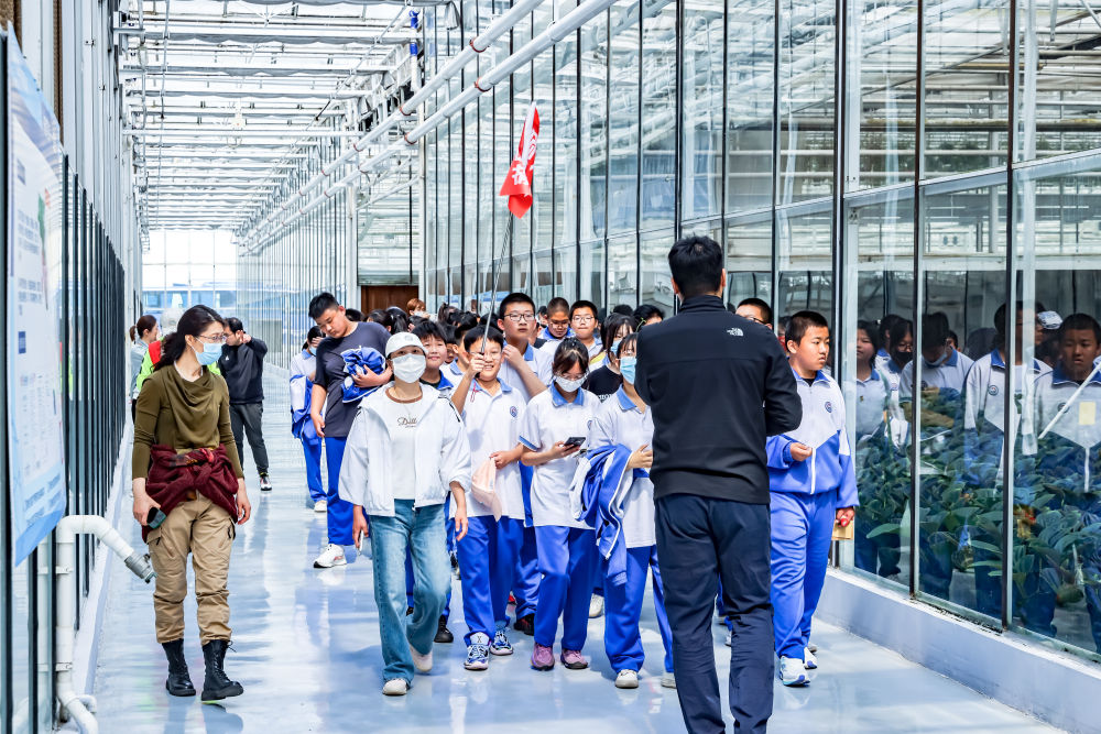学生们在天津市东信花卉有限公司智能化温室花卉种植基地参观。(受访者供图)