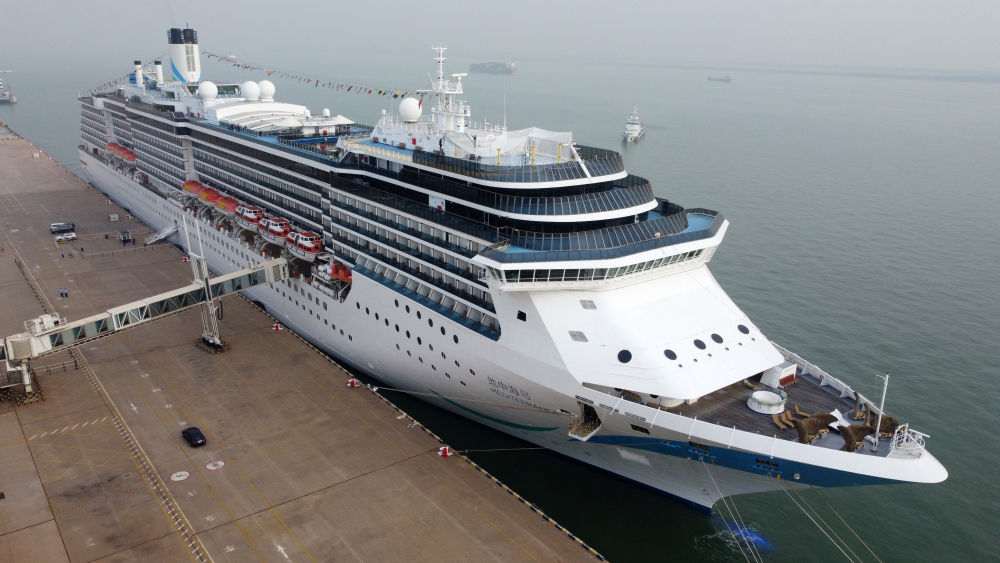 9月27日,爱达邮轮“地中海”号邮轮靠泊在天津国际邮轮母港(无人机照片)。新华社记者 赵子硕 摄