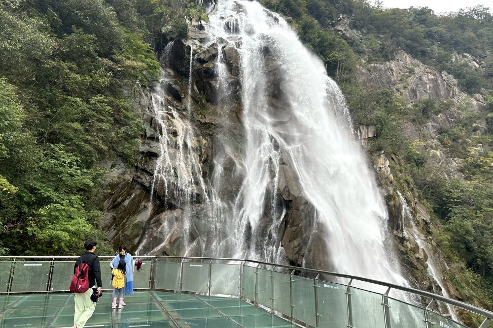 游客在位于安徽省安庆市岳西县黄尾镇的大别山彩虹瀑布风景区内游玩(10月12日摄)。新华社记者 栾若卉 摄