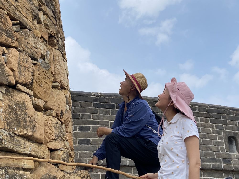 此处长城砖石非人们所熟识的青石方砖,而是就地取材的不规则黄色山石。她指着山石缝隙里的白灰说:“这个是原来的勾缝材质,纯白灰,就是当时在长城附近的小窑烧制成的,白灰用得越久,黏度越大。在长城修缮的过程中,我们要求尽量用原材料采用古法做白灰来修筑。”