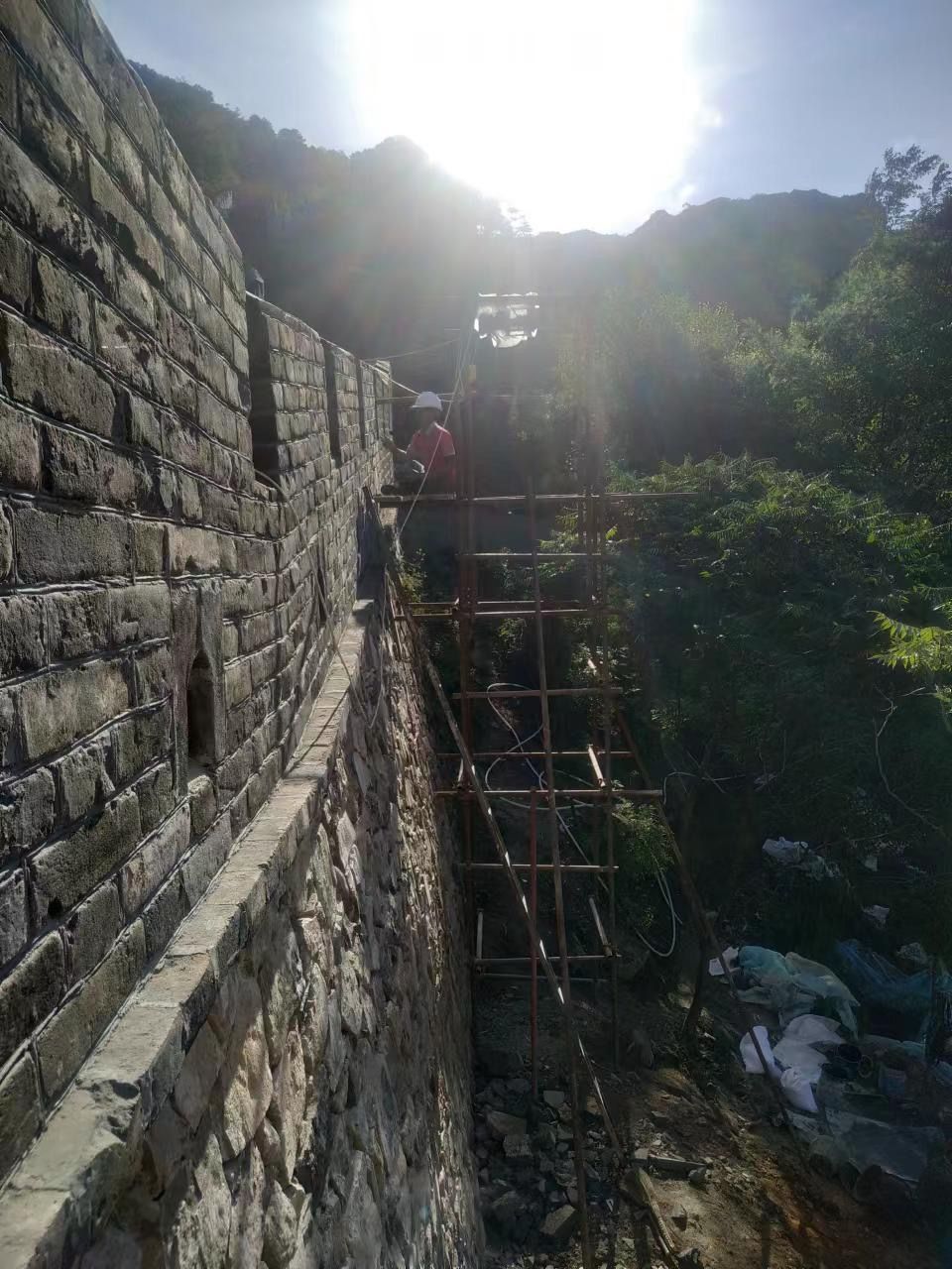 施工人员对受损墙体分层归位、夯实、恢复马道与垛墙。对轻微鼓闪段墙体灌浆加固,对松动、脱落的石材进行补配、归安;对严重鼓闪墙段进行锚杆加固;对破损、缺失的青砖地面进行补砌。