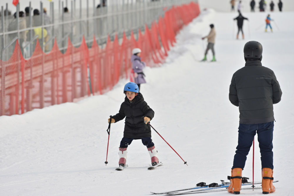 游客在位于罗庄子镇的蓟州溶洞景区冰雪世界体验滑雪。新华社记者宋为伟摄