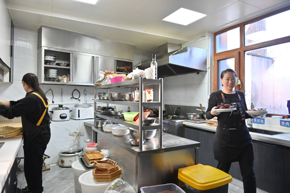 潘娜(右)在她的“知归晓苑”民宿厨房为客人端出早餐。新华社记者宋为伟摄