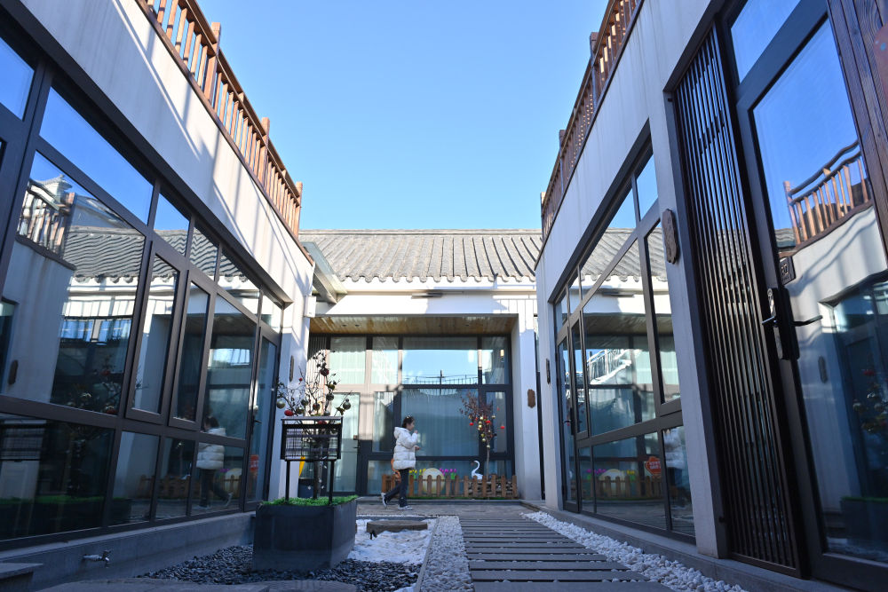 一名游客在潘娜的“知归晓苑”民宿庭院内活动。新华社记者宋为伟摄