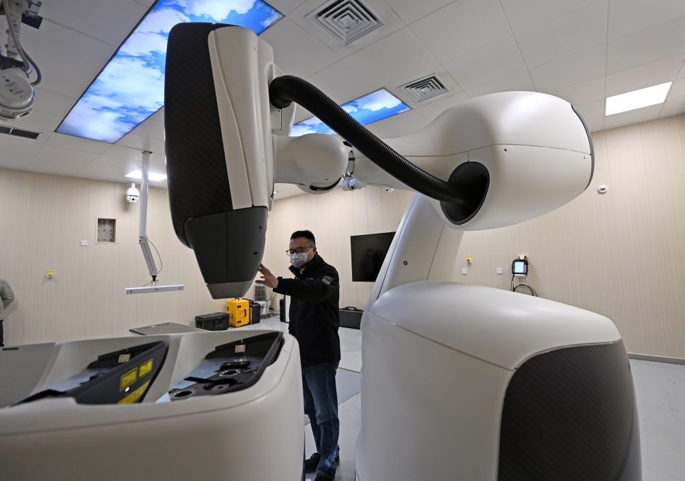 除了新能源汽车,生物医学工程技术和先进医疗设备产业也成了东丽区的亮丽名片。在中核安科锐(天津)医疗科技有限责任公司的厂房内设有一间“模拟医院”,正在测试和展示螺旋断层放射治疗系统、X-射线立体定向放射外科手术机器人等放疗设备,这些“科技感”满满的庞然大物做的是打击肿瘤的“精细活”。