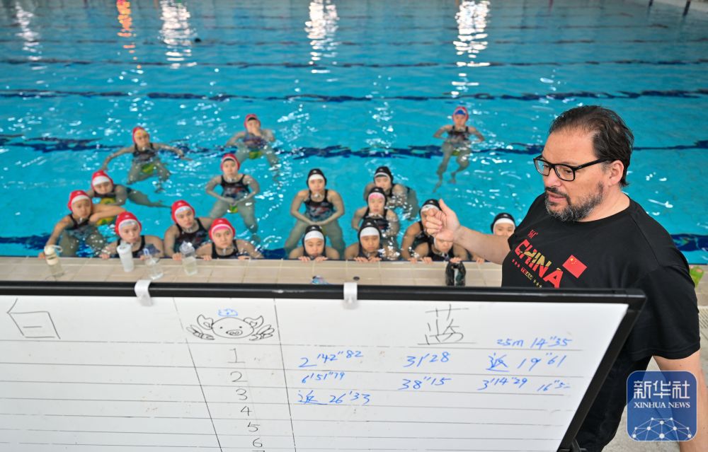 ↑塞奥哈里斯(中)在泳池边指导球队进行训练(4月24日摄)。