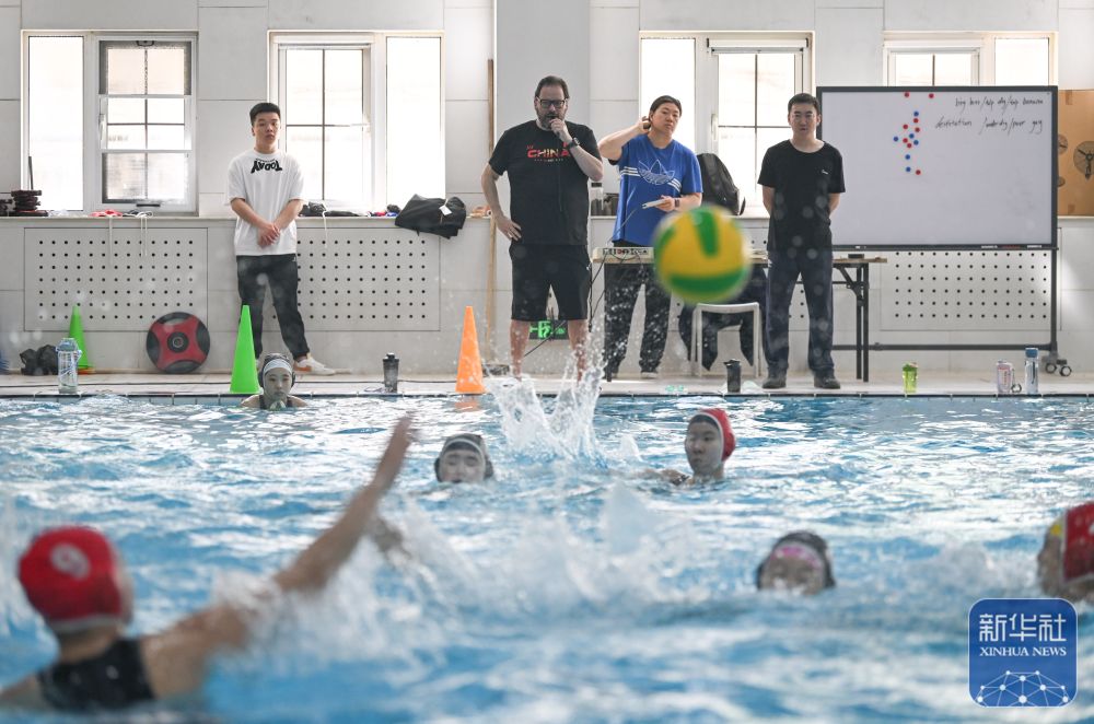 ↑塞奥哈里斯在泳池边指导球队训练(4月24日摄)。