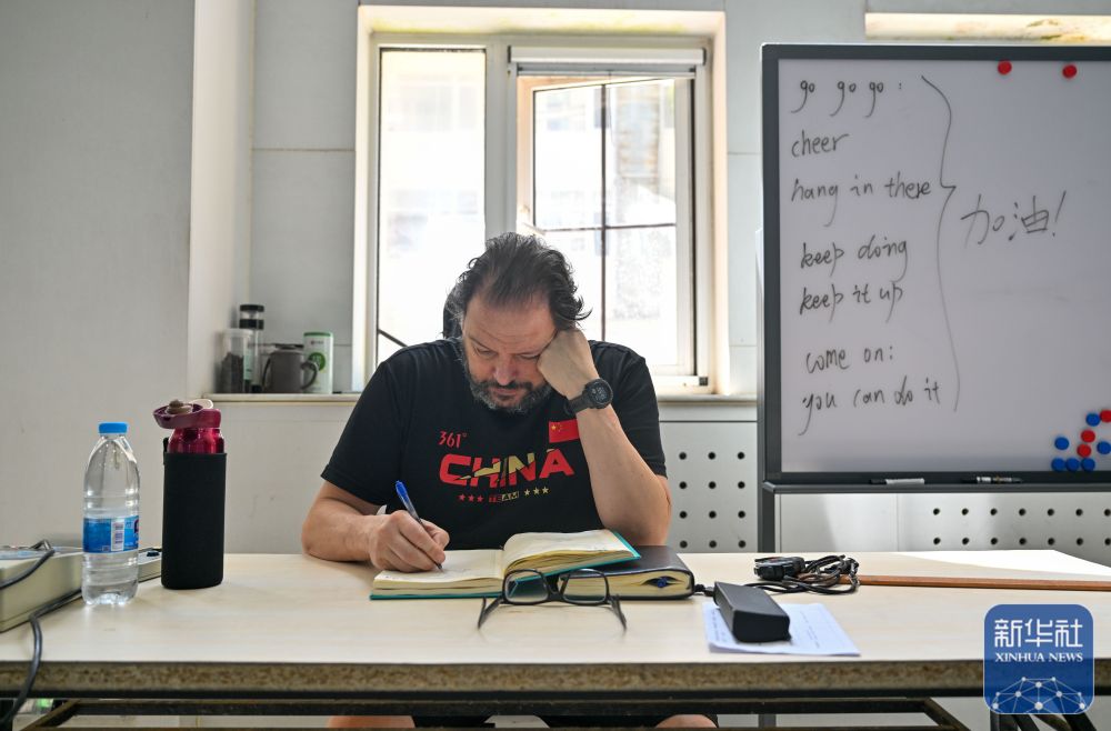 ↑塞奥哈里斯在泳池边做笔记(4月24日摄)。