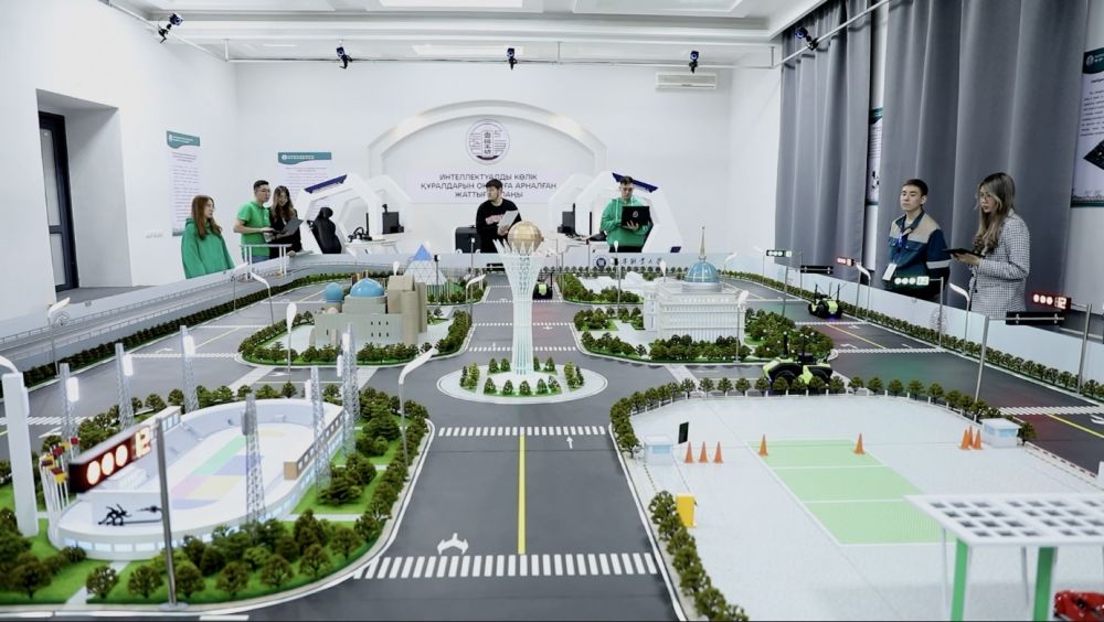 在哈萨克斯坦东哈萨克斯坦州首府厄斯克门,几个身穿绿色校服的学生在巨大的智能网联汽车沙盘前操作电脑控制小车行驶。这里是由天津职业大学与东哈萨克斯坦技术大学共同建设的鲁班工坊。