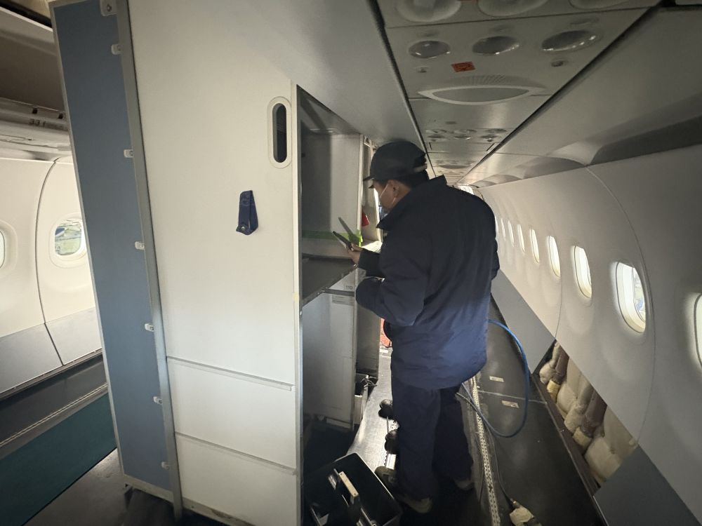 天津海特飞机工程有限公司工人正对客机进行“客改货”改装。(宋亭瑞 摄)