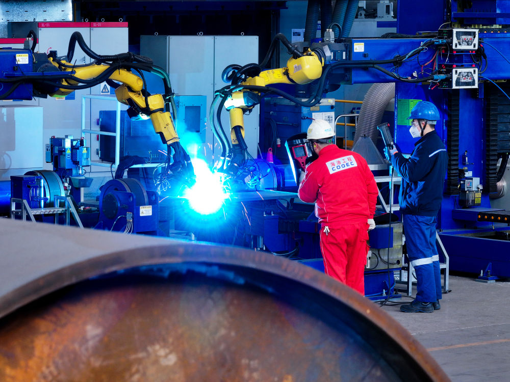 “这是我们联合哈尔滨工业大学、天津大学等院校研发出的‘加强环双面双弧智能焊接机器人’,它能减少工人作业风险,焊接效率提升至少一倍以上。”海油工程天津智能制造基地结构制管车间经理马亚光说。