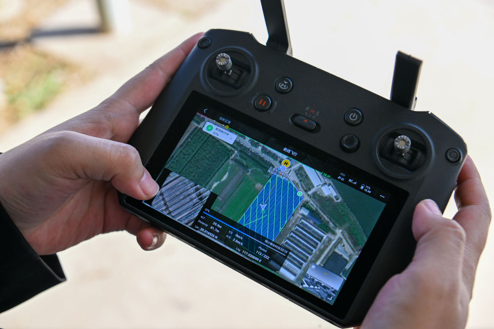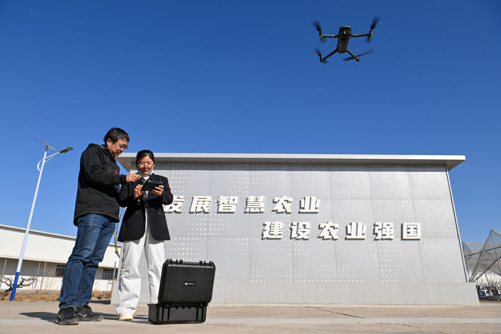 ↑在农芯科技(天津)有限责任公司智慧农业园区,科研人员操作搭载多光谱相机的无人机开展建图作业(3月20日摄)。