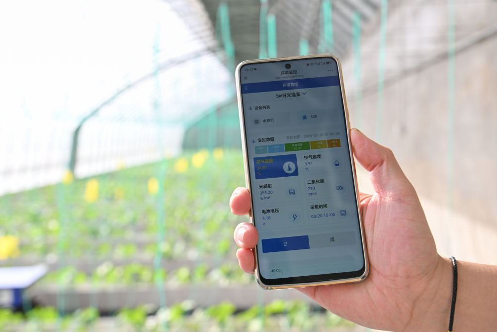 ↑在农芯科技(天津)有限责任公司智慧农业园区,科研人员通过手机实时查看温室内的环境数值(3月20日摄)。