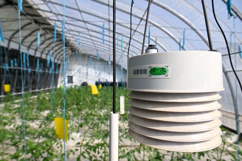 ↑这是3月20日在农芯科技(天津)有限责任公司智慧农业园区智能温室内拍摄的用于监测环境数值的捕捉器。