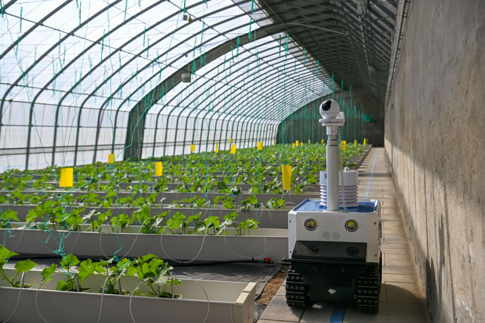 ↑无人巡检机器人在农芯科技(天津)有限责任公司智慧农业园区智能温室内巡控(3月20日摄)。