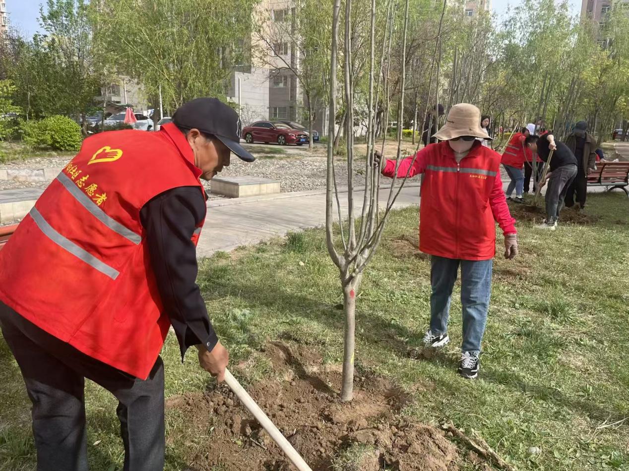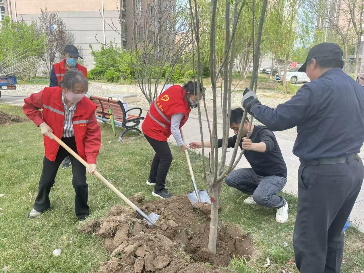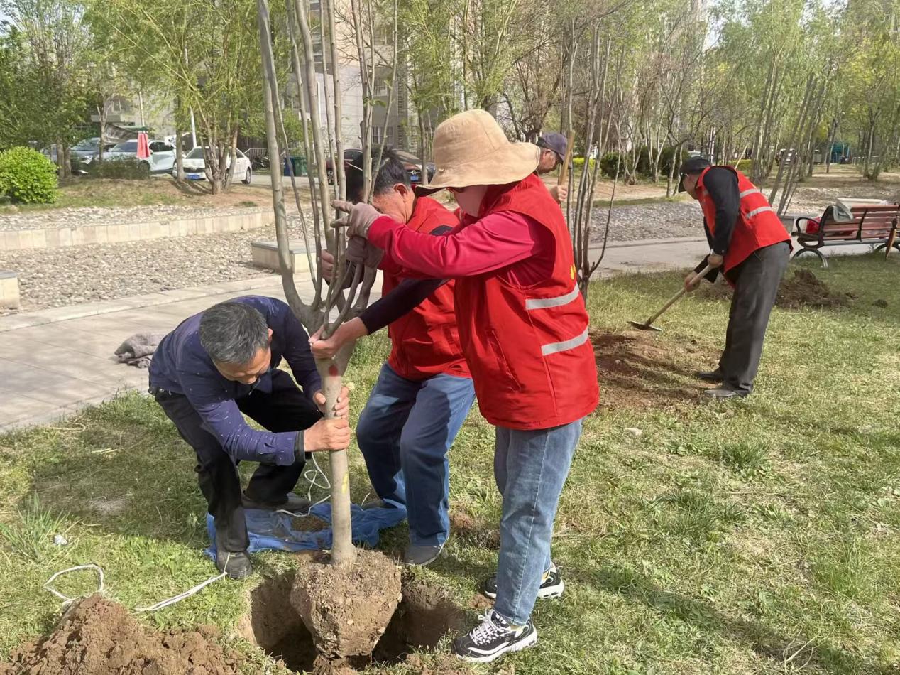 活动中,在社区工作人员的带领下,党员志愿者们纷纷拿起铁锹、锄头等工具,投入植树的热潮中。大家热情高涨、干劲十足。志愿者们按照分工,通力协作,扶直苗木,每个步骤都严谨细致,确保每一棵树苗都能在这片土地上扎根生长。经过大家的辛勤劳动,海棠树苗整齐挺立,在春风中轻轻摇曳,展现出勃勃生机,为春阳社区增添了一抹清新而亮丽的风景。