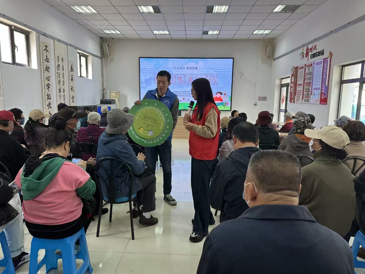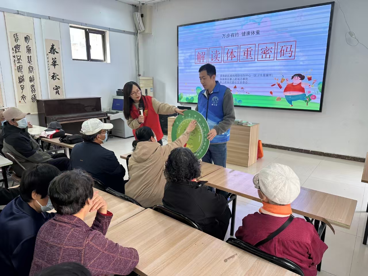 首先在社区活动室内,一场知识盛宴拉开帷幕。区疾控中心的杨老师以趣味十足的“体质转盘”为切入点,深入浅出地为居民们解锁体重管理的“四大法宝”。控油壶、限盐勺、腰围尺、体质转盘这些看似普通的小工具,在杨老师的讲解下纷纷“大显神通”,生动形象地展示了膳食营养搭配与科学运动的原理。
