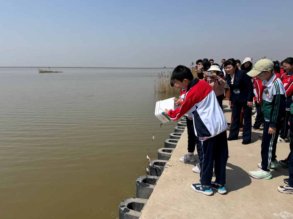 随后,两校师生在工作人员的带领下,深入天津市北大港湿地自然保护区内进行投放鱼苗和现场观鸟的实践活动。学生们亲自参与投放鱼苗,近距离观察候鸟,与大自然亲密接触,真切感受到保护生态环境的重要性。北大港湿地自然保护区管理中心野保科负责人告诉记者,在鹳栖湖投放鱼苗可以改善湿地生态环境,为候鸟提供更丰富的食物资源,当日投放鱼苗重量为6000斤。在负责人的帮助和指导下,两名学生为一组亲自“投喂”,不少候鸟被吸引,让学生们更近距离观察候鸟,目光所及之处,是与生态亲密相拥的美好,每一次“对视”都进一步拉近了人与自然的距离,与生态脉搏同频共振。“以前只在书本上了解过候鸟,这次亲眼见到了,还参与了鱼苗投放。把鱼撒下去它们一会儿就飞来了,很神奇!感觉自己真正为保护湿地生态出了一份力,以后我还要参加更多这样的活动!”一名参与投放鱼苗的学生告诉记者。学生投放结束后,湿地工作人员将整车鱼全部投入湖内,候鸟越来越多,场面十分壮观。