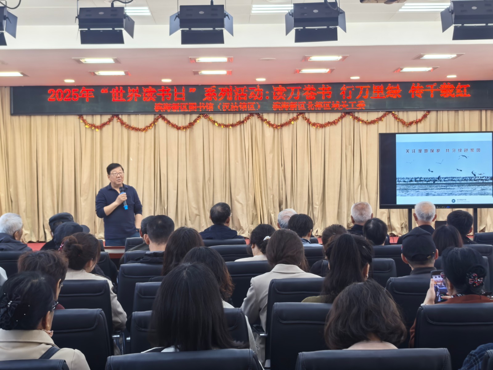 活动邀请到最美滨海湿地守护者、中国摄影家协会会员、滨海新区疆北湿地保护中心理事长王建民为读者带来《关注滨海湿地 共建绿色家园》的主题讲座。王建民用生动的画面,悠扬的音乐,讲述了多年来从事候鸟保护工作的经历,普及了候鸟迁徙知识。倡导生态保护理念,提升湿地保护意识,增强市民的环保责任感。