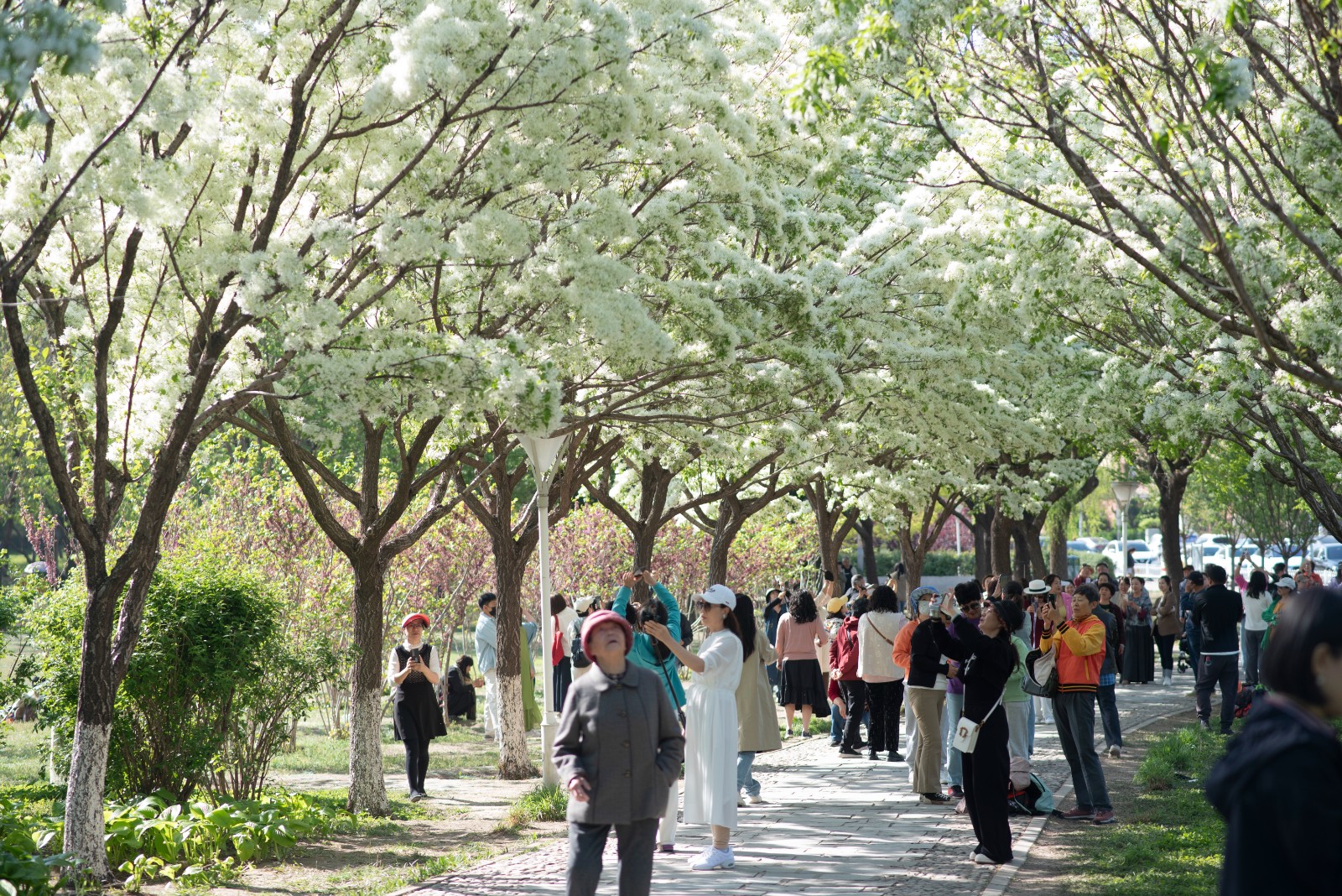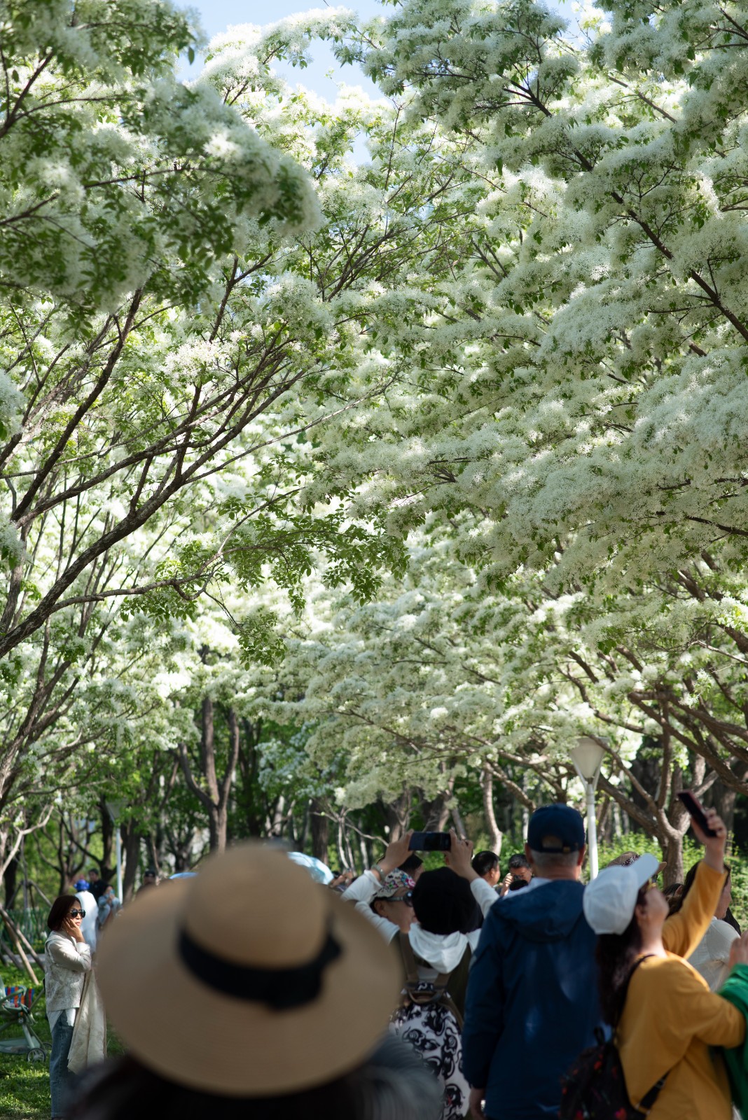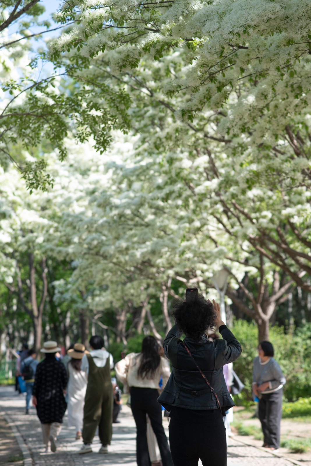 记者在现场看到,流苏散种于泰丰公园多处,其中靠北部中段有一条“流苏大道”,引得游客流连忘返。向东走到湖边又是一番美景,流苏与湖水相映,许多游客在此拍照打卡。