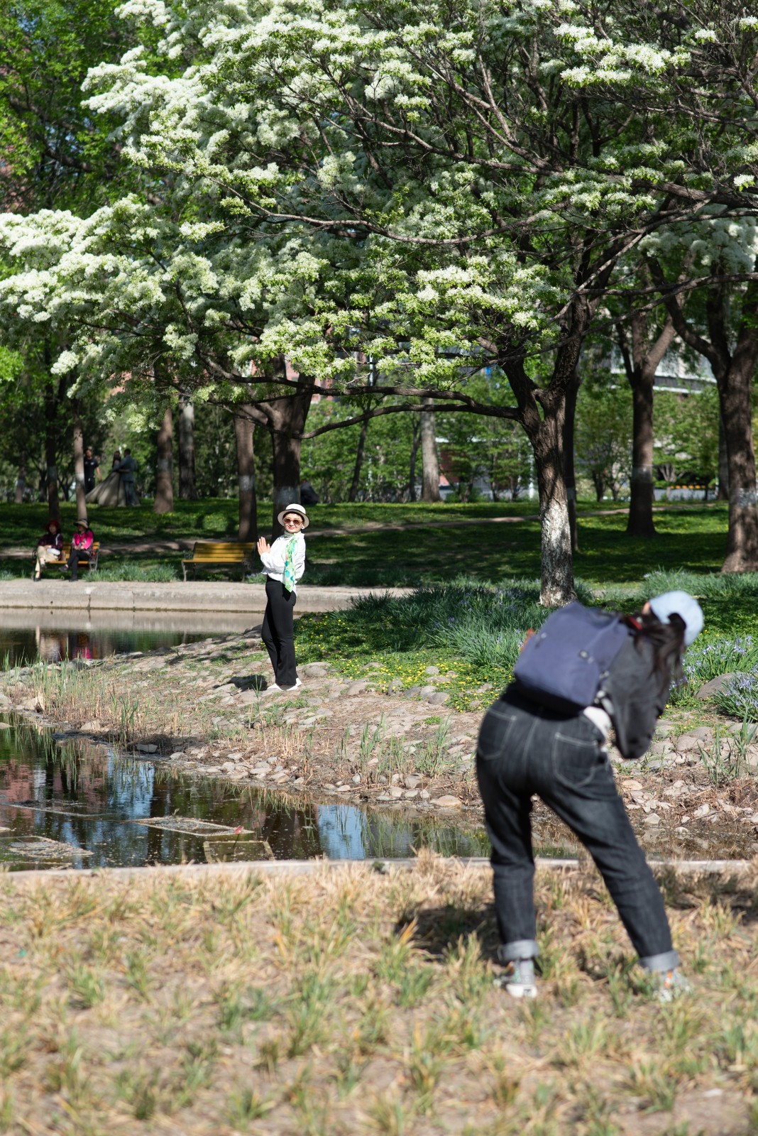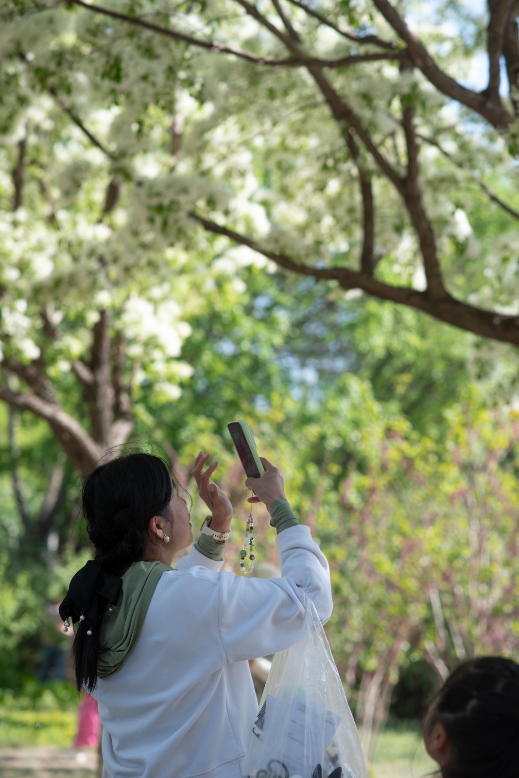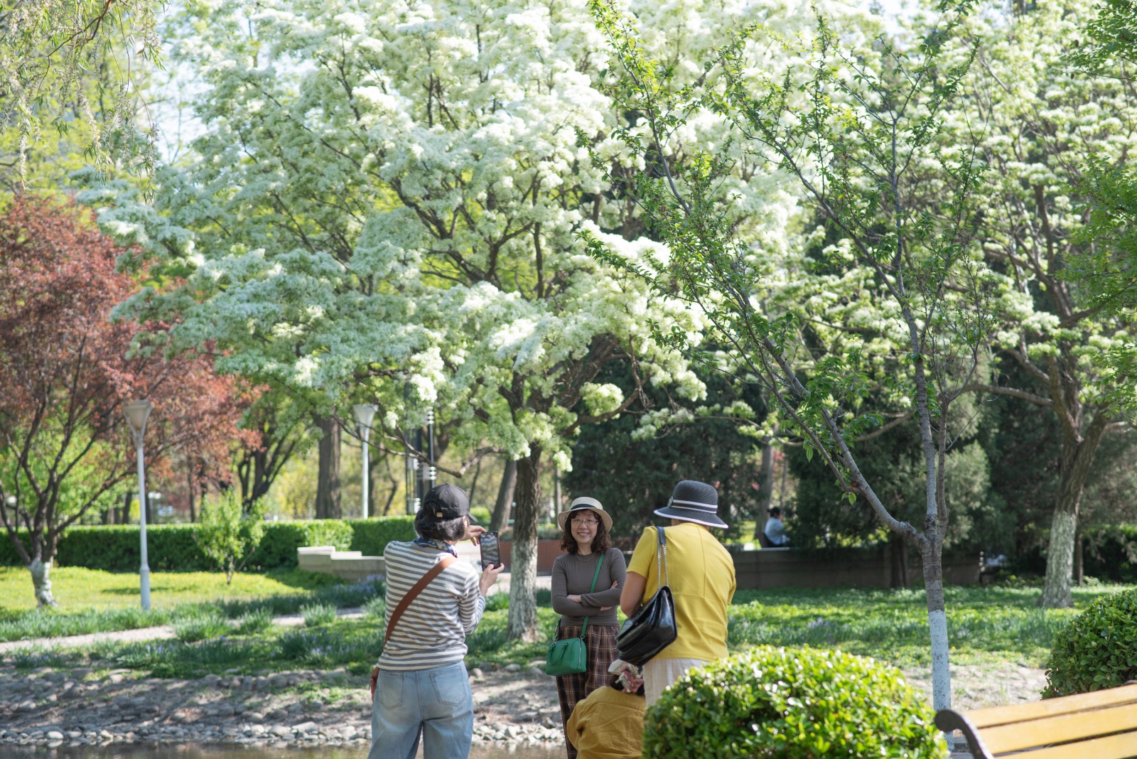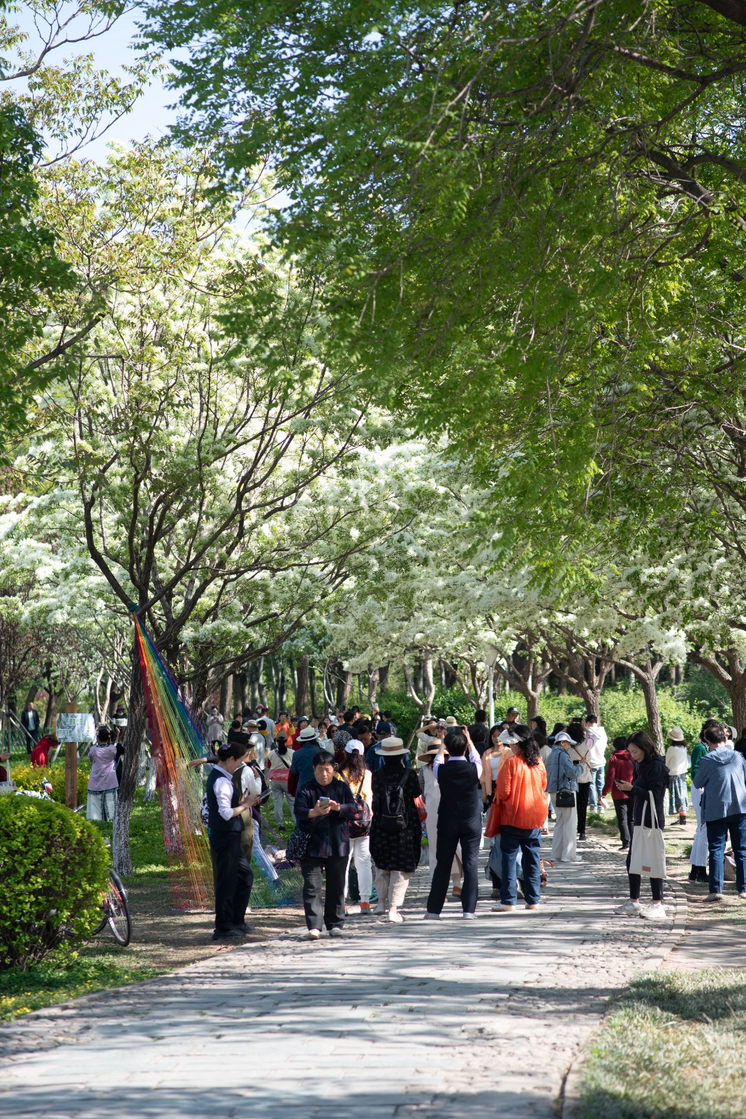 记者在现场看到,流苏散种于泰丰公园多处,其中靠北部中段有一条“流苏大道”,引得游客流连忘返。向东走到湖边又是一番美景,流苏与湖水相映,许多游客在此拍照打卡。