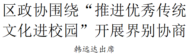 津滨网讯(记者 陈曦)4月23日,区政协在塘沽湾学校以“国学润校园、经典伴成长”为主题,聚焦“推进优秀传统文化进校园”开展界别协商。区政协主席韩远达,副主席杨焕香、丁全海出席。