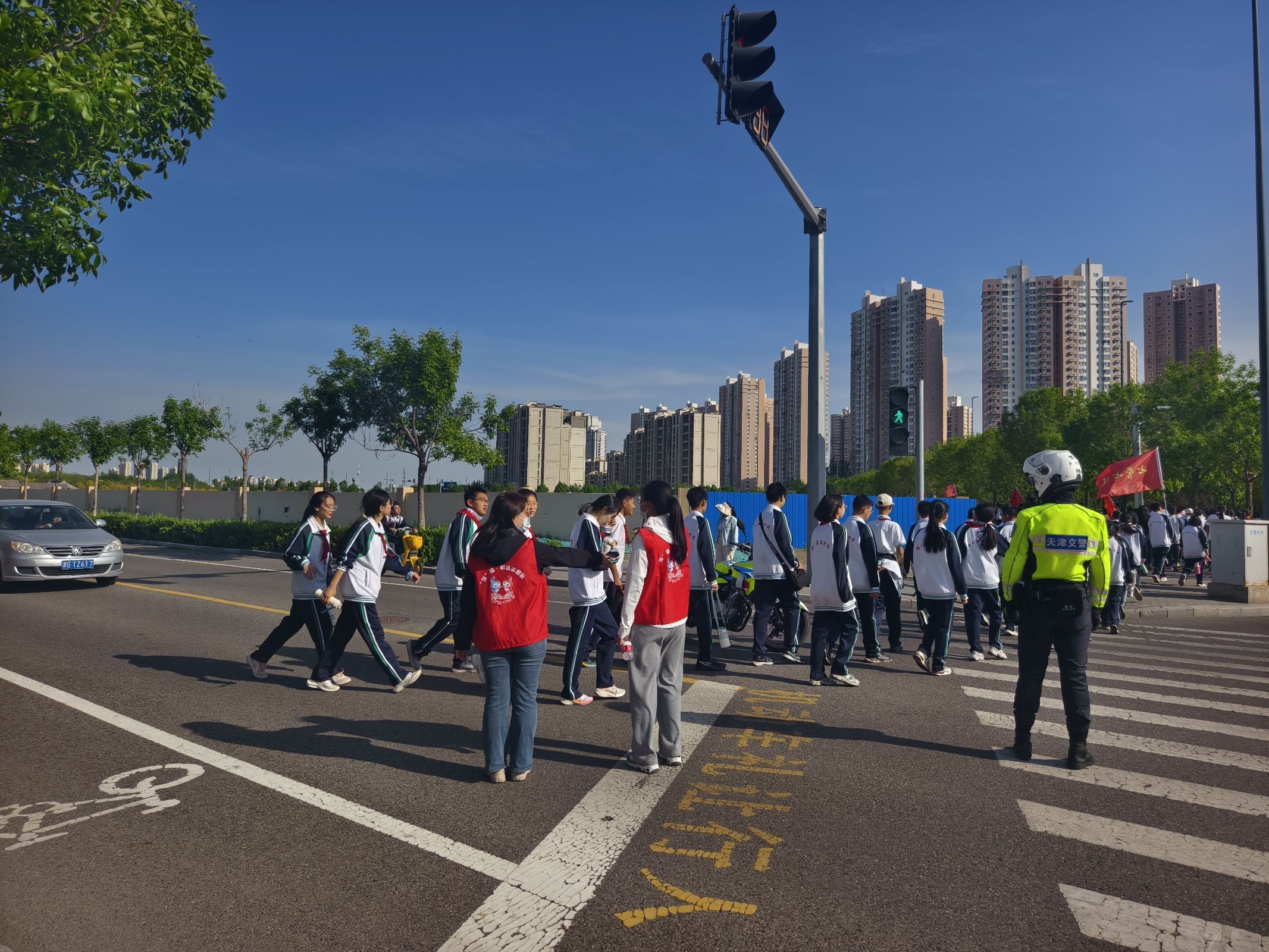 活动以“重走长征路”为主题,选取社区周边步道设置模拟路线,全程5公里,中途开展了国防知识问答活动,讲述国防故事等,将思政教育从课堂延伸至户外,既锻炼青少年体能意志,又强化国防安全意识,让红色基因在新时代青年中传承延续。社区网格员也加入活动中,在重要路口、点位守护学生安全,筑起安全防线。