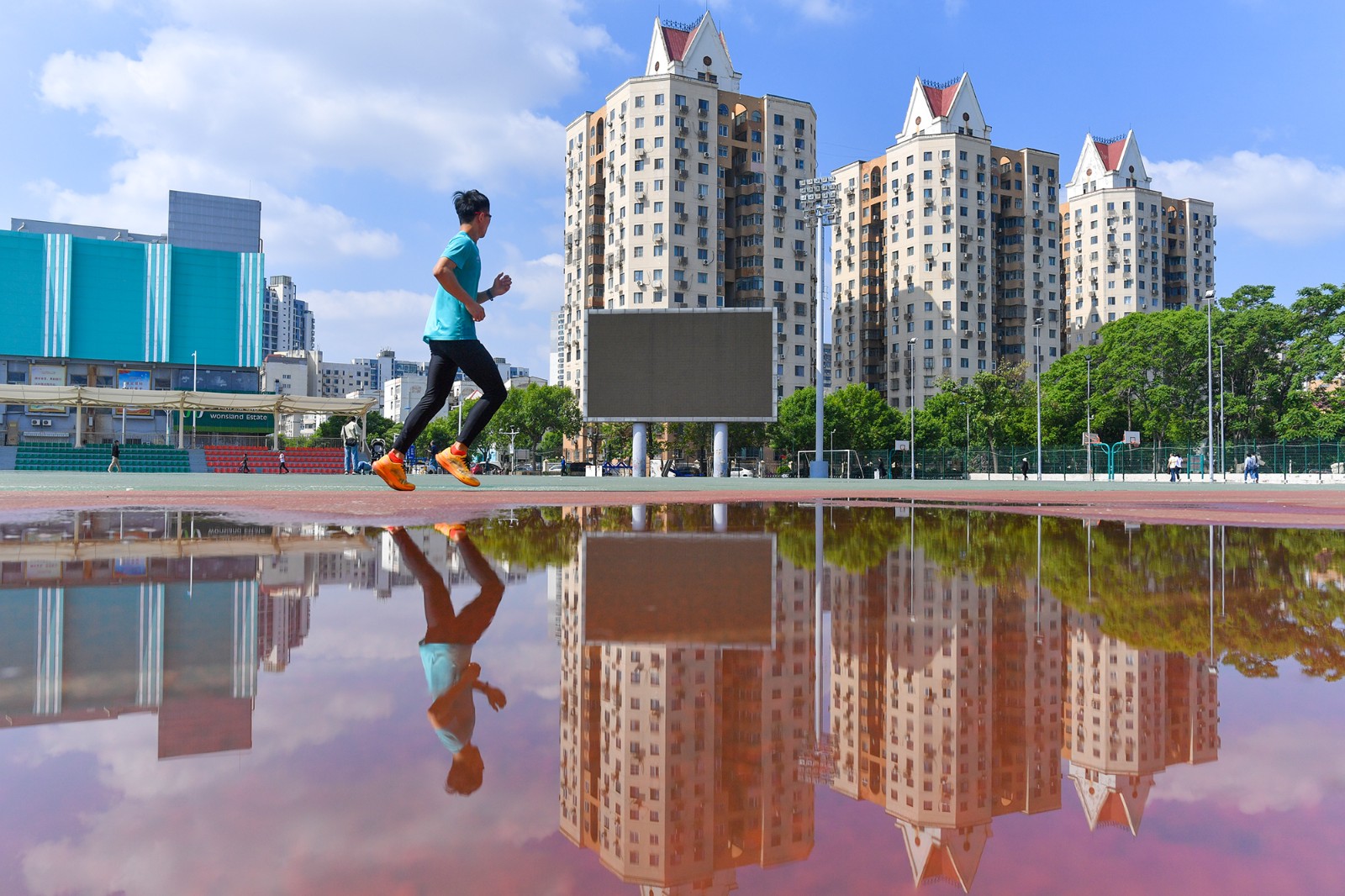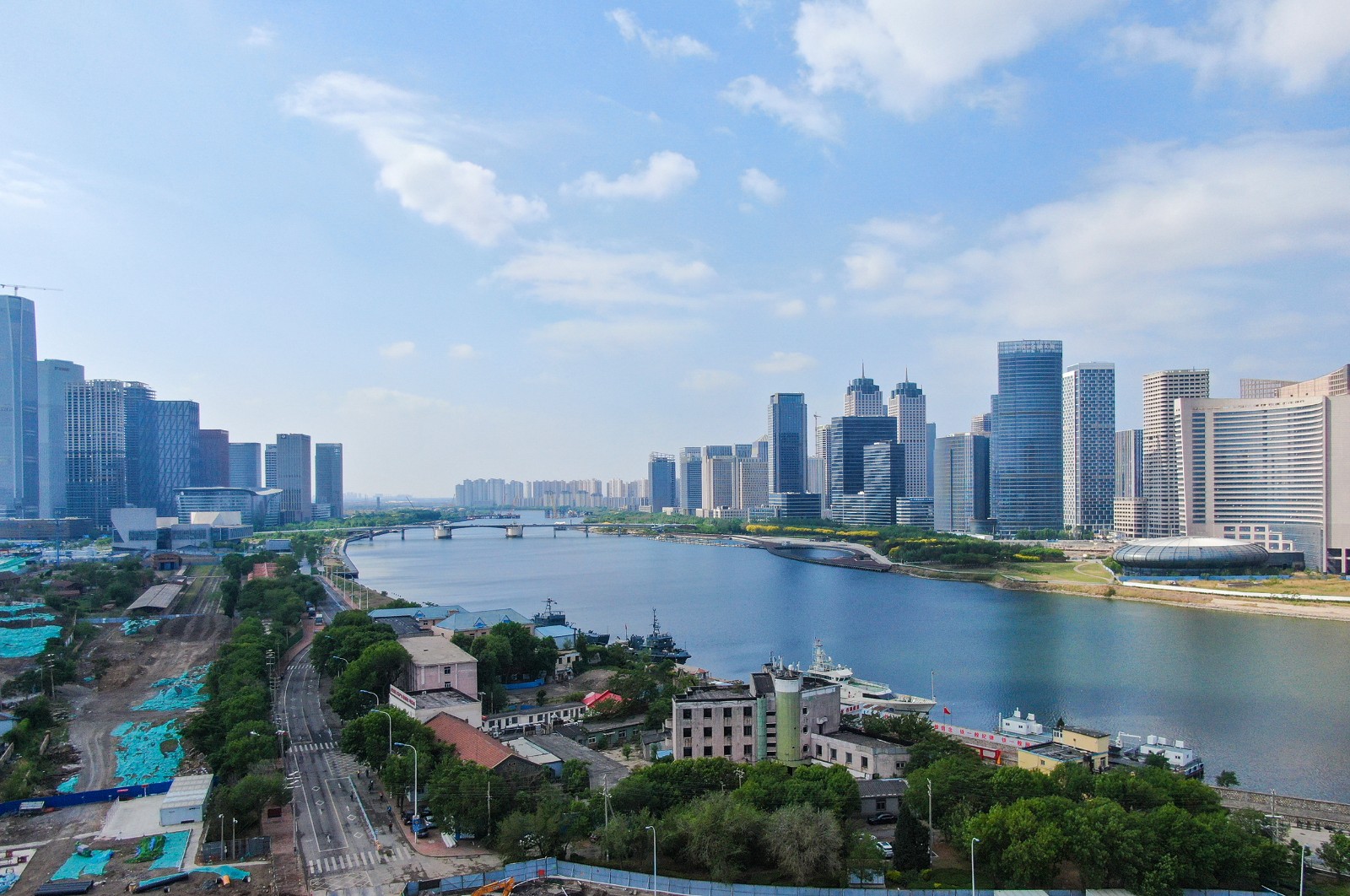 在经开区第三大街体育场,跑道上已有不少晨练的市民,他们或慢跑或散步,享受着雨后清新的空气,活力身影为晨间的体育场注入生机。而海河两岸,碧水映蓝天,微风拂过,河面泛起层层涟漪,沿岸的高楼在蓝天白云的映衬下更显挺拔,构成一幅清新亮丽的城市画卷。
