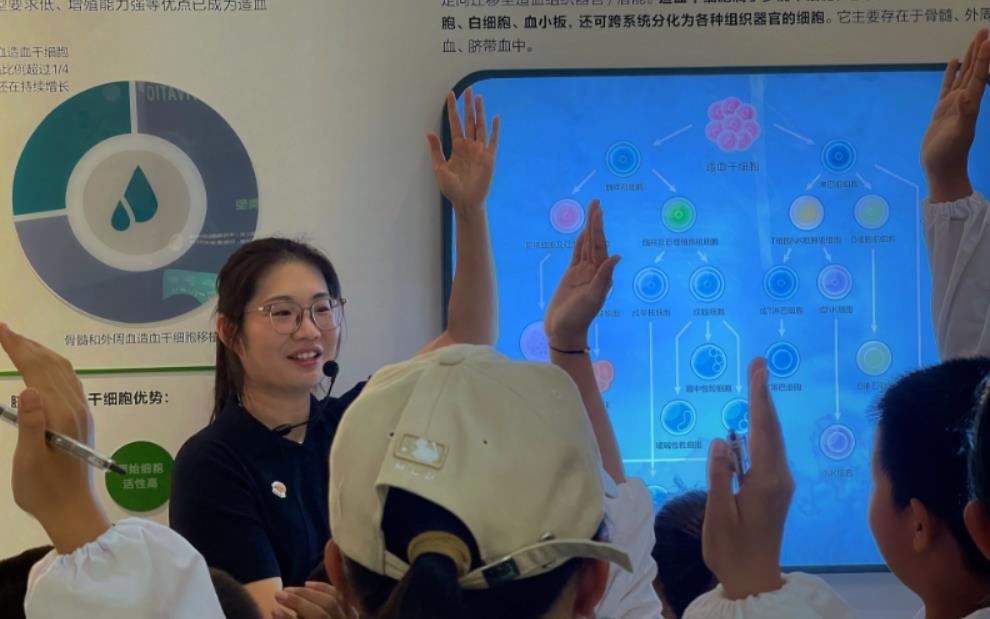 5月3日,内蒙古的32名学员怀揣着同样的热忱接续这场探索之旅。参观过程中,学生们热情高涨,不断提出充满奇思妙想的问题,许多学生的笔记本上密密麻麻地记录着“造血干细胞”“免疫调节”等专业术语。面对孩子们“为什么冻存的细胞不会死亡?”“干细胞能让人长生不老吗?”等天马行空般的提问,基地科技志愿者用通俗易懂、深入浅出的方式一一解答。来自内蒙古的五年级学生王同学深受触动,他表示:“我以后也想研究能让细胞复活的技术。”基地负责人表达了他们的坚守:“作为国家级科普平台,构建全龄段科学教育体系是我们肩负的重任。针对青少年这一充满活力与潜力的群体,特别设计的‘观察—实践—创造’三阶学习模式,旨在让复杂的前沿科技变得可触、可感、可用,从而激发他们内心深处的科学潜能。”