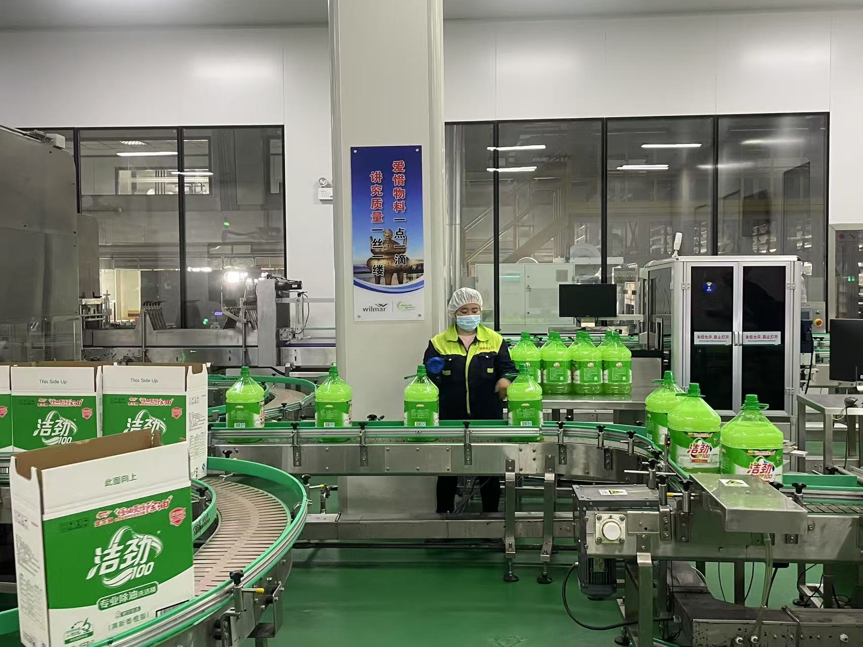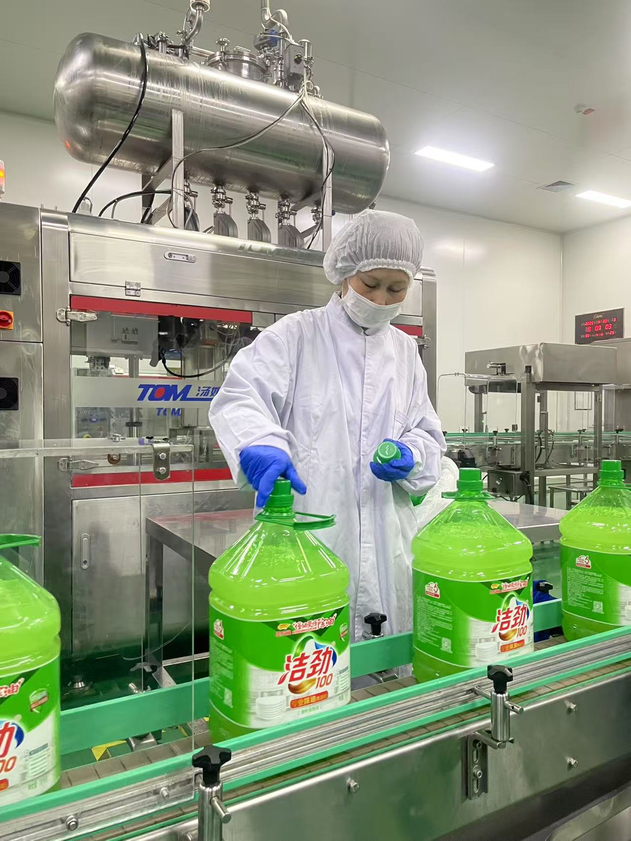 在日化车间“洁劲100”品牌的液洗产品生产线上,全自动化机器设备正对一个个包装瓶进行灌装、旋盖、称重作业。再经历包装、视觉检测、装箱、封箱等环节,整套工序全部完成后,这些产品将被运输至全国各地,大部分将进入餐饮企业投入使用。