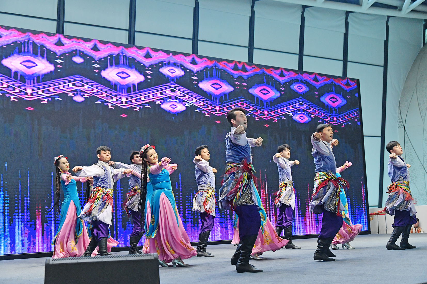 在新疆,音乐与舞蹈总是无处不在。演出中,来自新疆乌鲁木齐、阿勒泰地区、和田地区、克孜勒苏柯尔克孜自治州等多个地区的近百名艺人与新区的文艺工作者们同歌共舞。手鼓、冬不拉、库姆孜等新疆特色民族乐器演奏出的音乐轻快悦耳、绕场不绝;舞蹈演员们扬眉动目、晃头移颈、拍掌弹指,将异域风情展现得淋漓尽致。打击乐合奏《生生不息》、笛子与手鼓《帕米尔的春天》、群舞《洛浦欢歌》《舞韵》、冬不拉弹唱《黑走马》《可爱的一朵玫瑰花》以及富含民族风情的《玛纳斯与阿勒曼别特的兄弟情缘》《阿拉木汗的婚礼》,每一个节目都收获了现场观众的热烈掌声与欢呼。“这是我第一次见到大海,所以我非常兴奋,把最好的演出状态带给了观众们。同时,我也能够感受到大家对于新疆的喜爱!”群舞《舞韵》的演员麦合皮再姆·艾尔肯希望将新疆多民族的文化传播到全国各地。